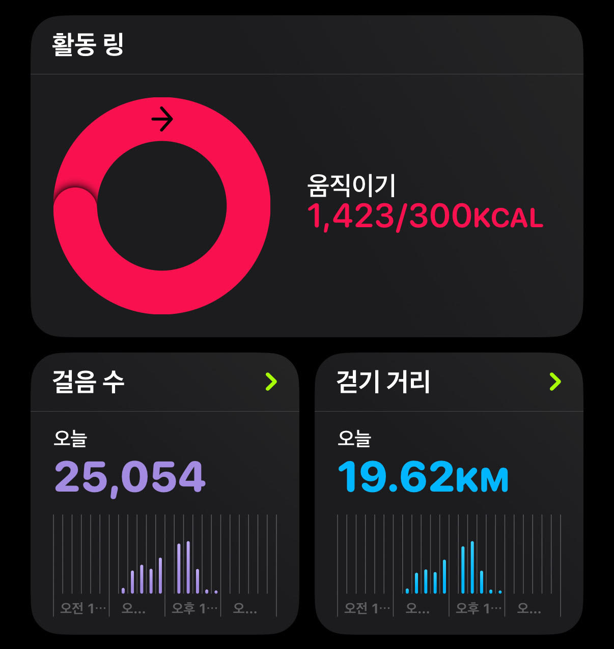 오늘 하루 19.62km에 25,054보를 걸었다.