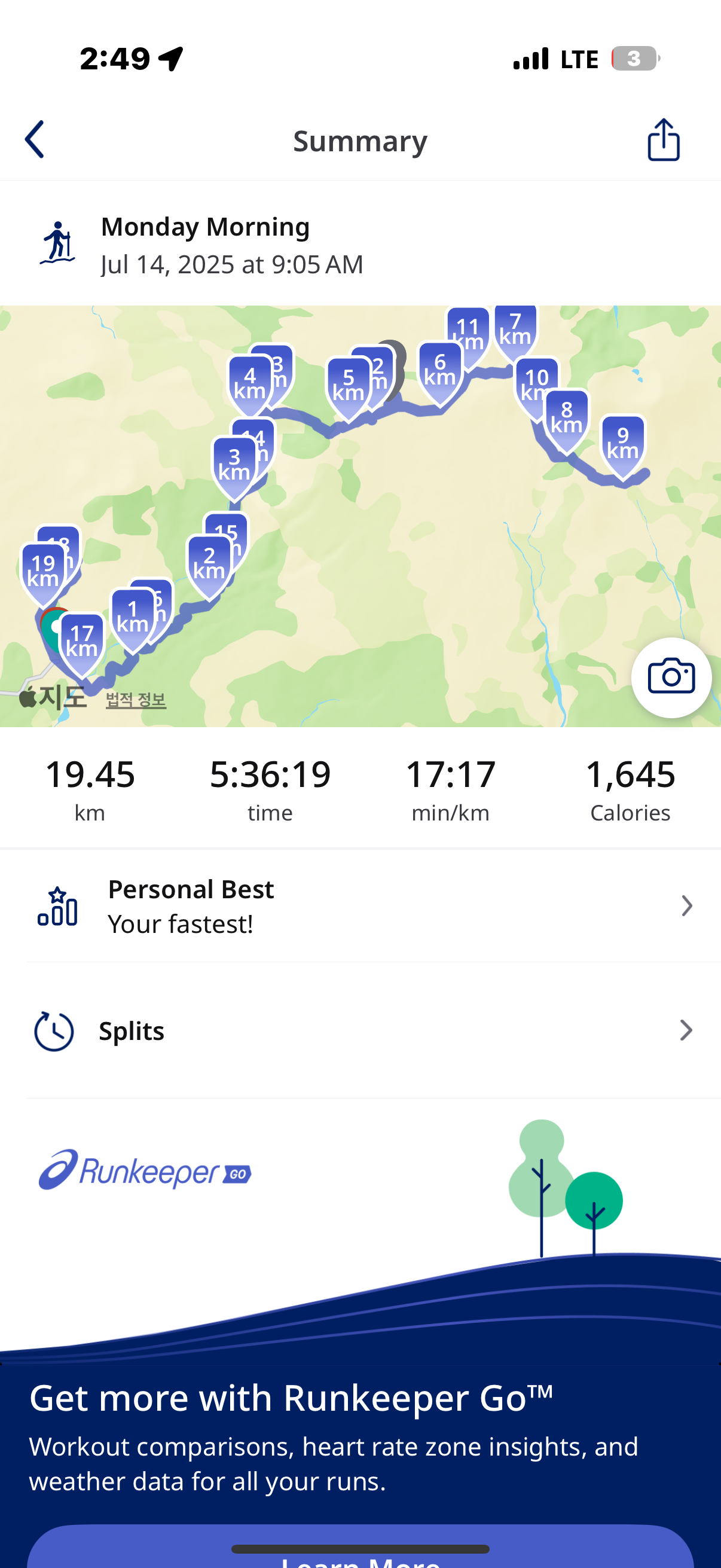 오늘 영실 코스는 총 19.45km를 5시간 36분 동안 걸었다.