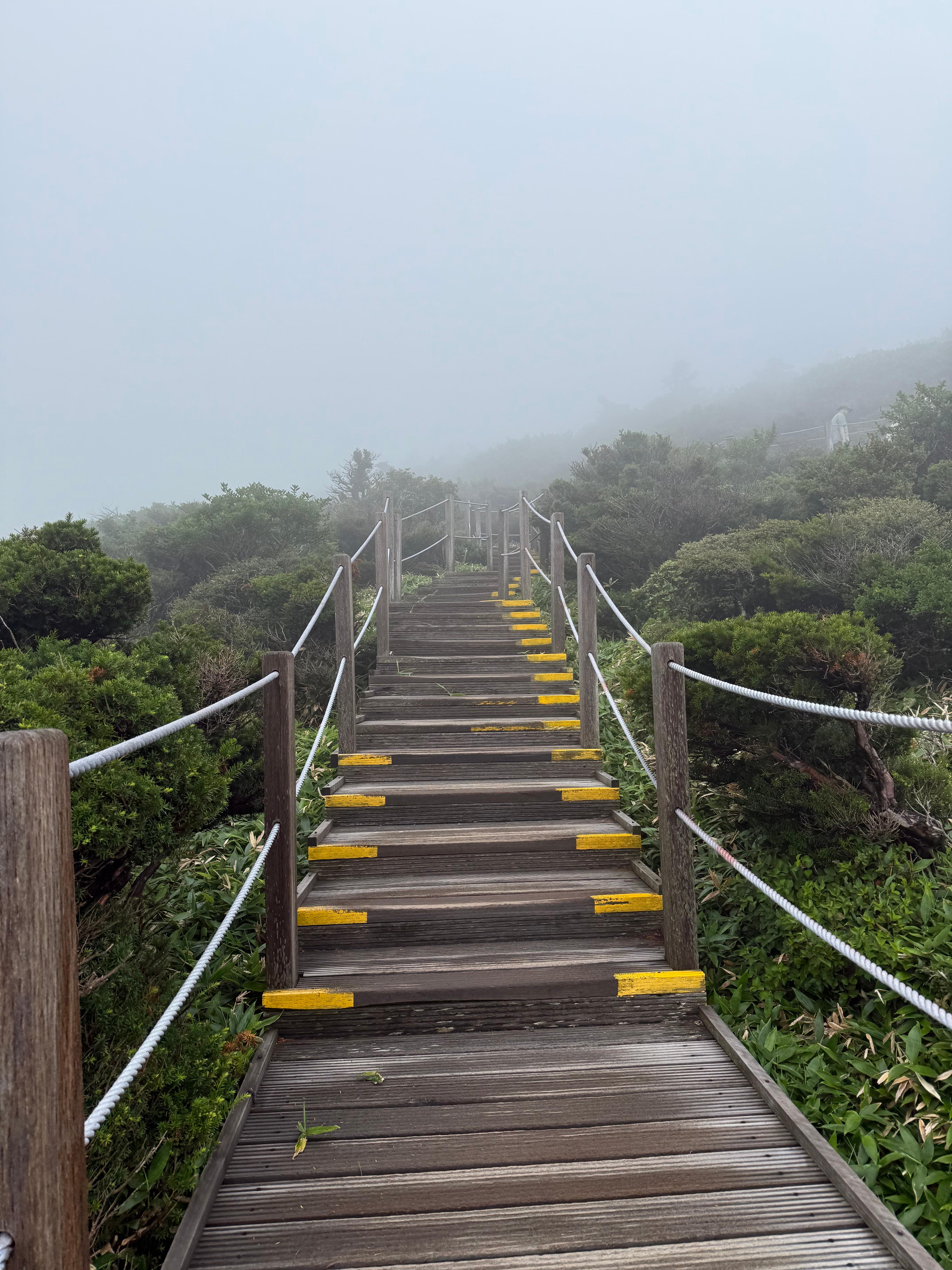 계단을 오르다가 힘들어 잠시 쉬면서 뒤를 돌아보니, 어느새 맑은 날씨는 어디 가고 내가 구름 속에 들어와 있었다.
