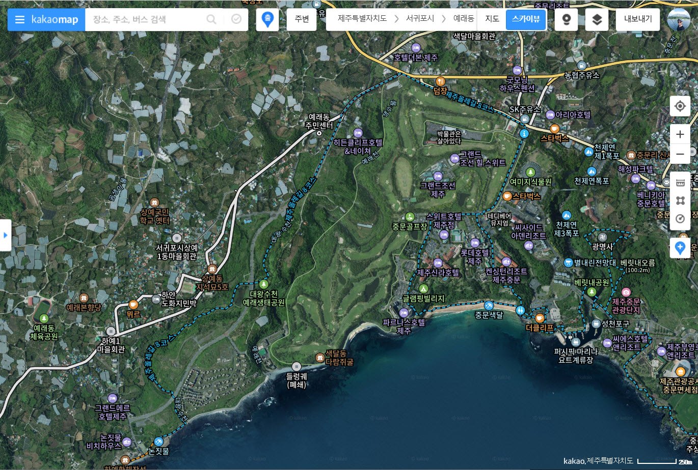 내륙으로 들어가 'ㄷ'자로 다시 해안가로 돌아오는데, 우회하는 이유가 바로 중문 골프장 때문이다.