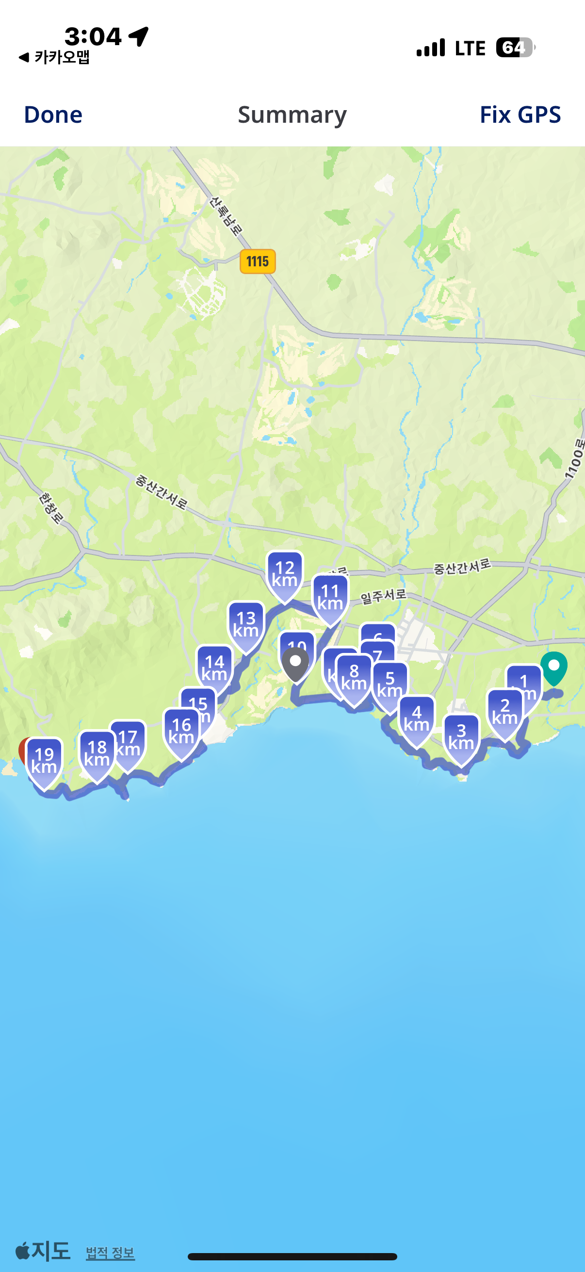 중간에 두 번 GPS가 일시정지되어 정확한 기록이 아니어서 만보기와 함께 비교했다.