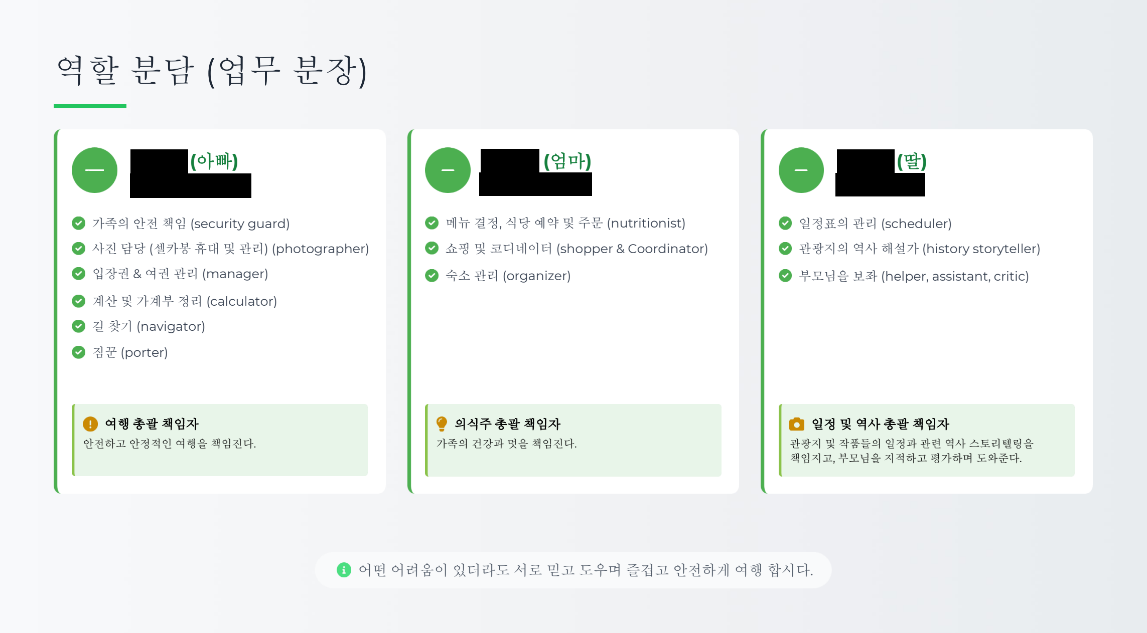 5. 세 식구 각자에게 임무를 부여했다. 짐꾼은 내가 하면 되는데 짐 때문에 못할 일들을 아내와 딸아이에게 배분했다. 무려 '업무분장'이라는 명분으로 할 일들을 정해줬다. 나는 '여행 총괄 책임자'라고 명명했고, 아내는 '의식주 총괄 책임자, 딸아이는 '일정 및 역사 총괄 책임자'라고 지정했다. 가족들의 반응이 꽤 괜찮았다.
