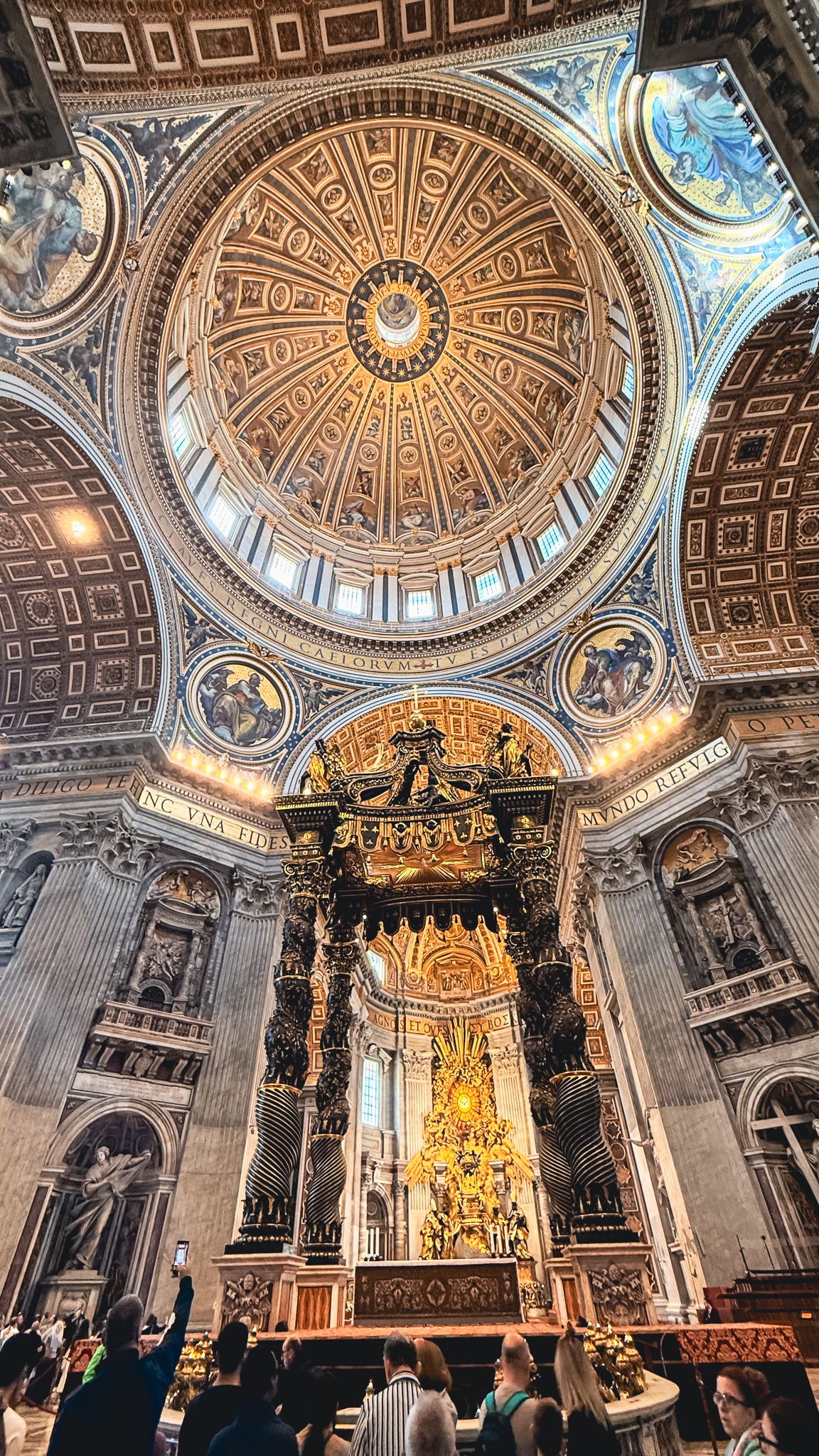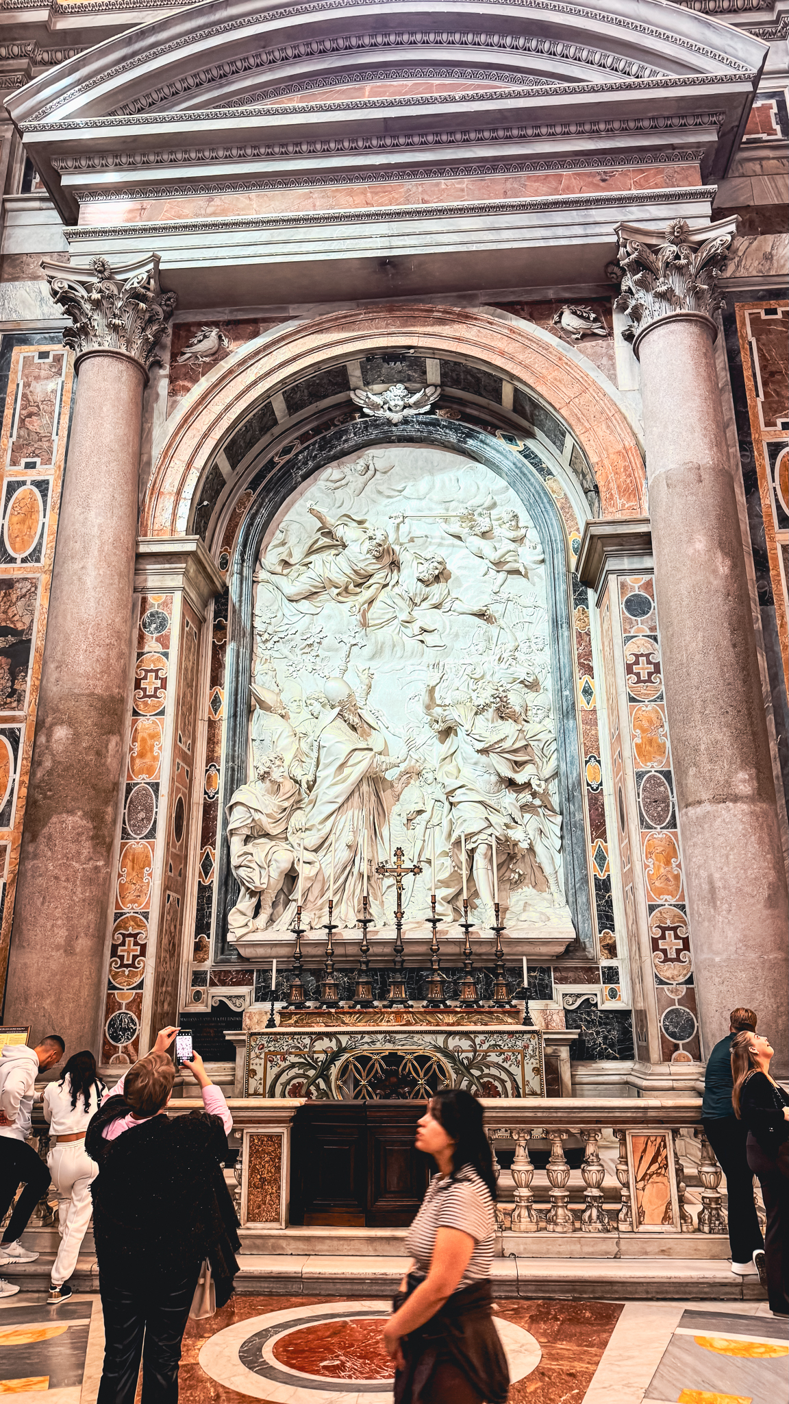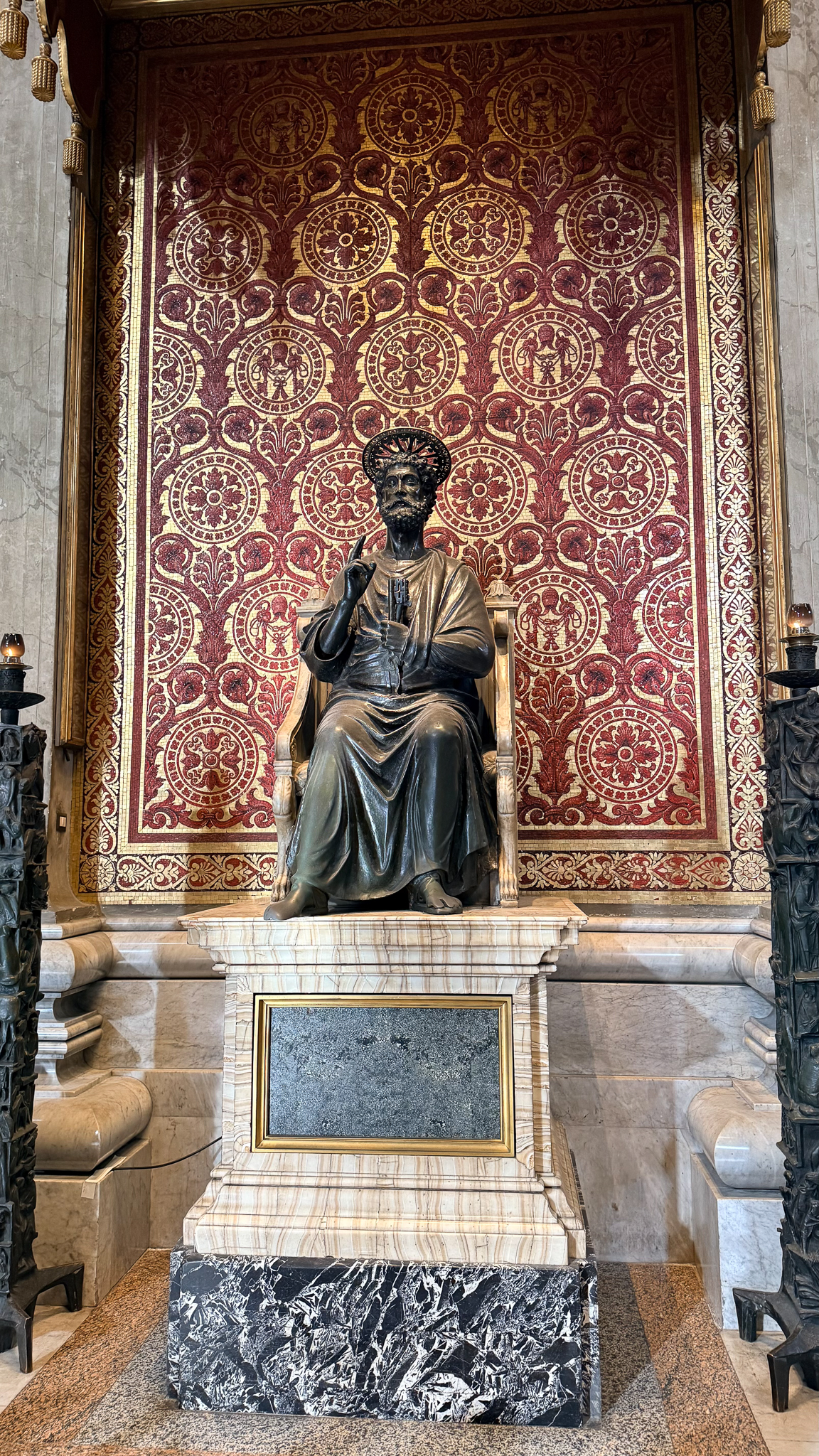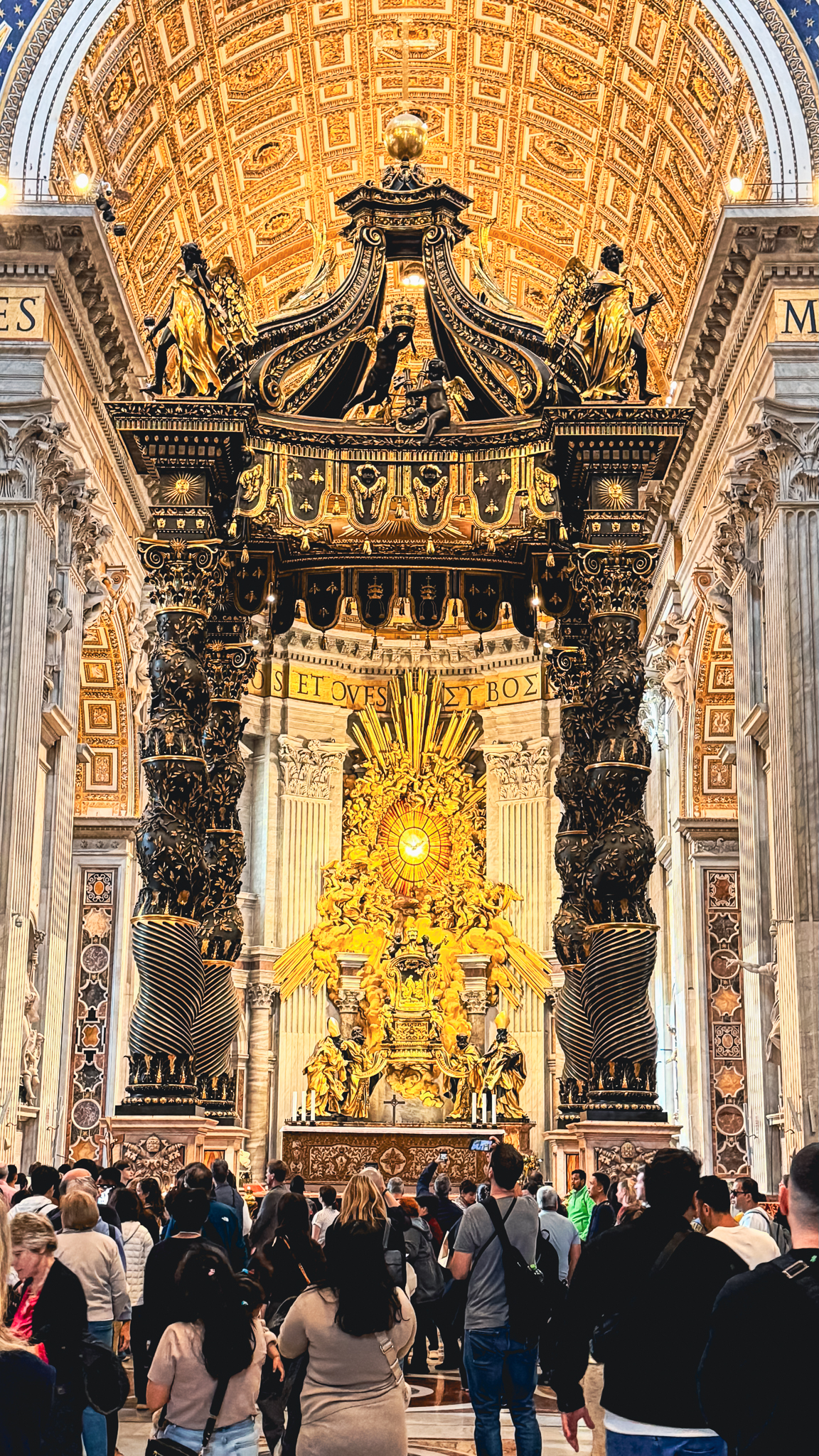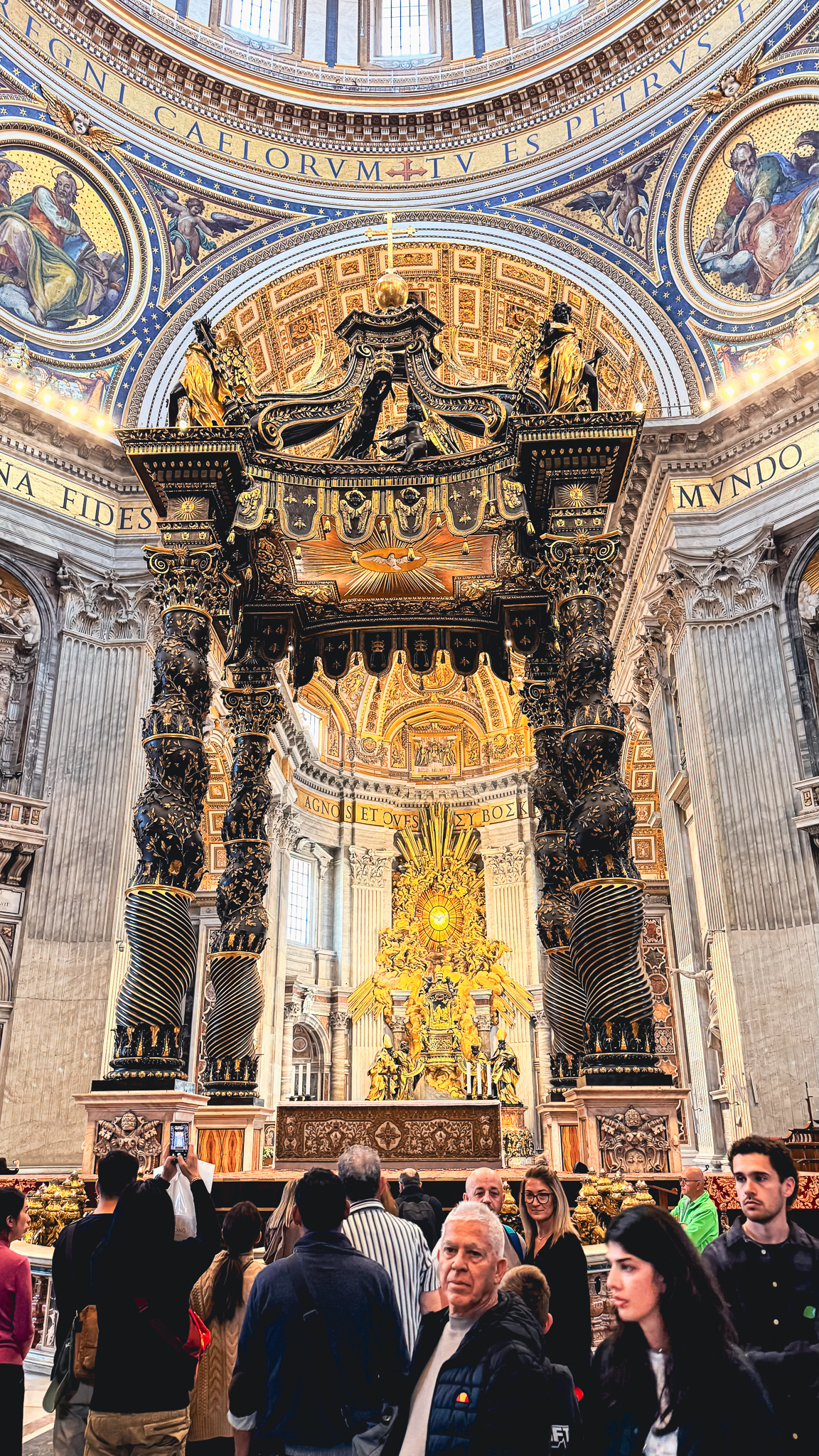 공부해보니 판테온 천장에 청동으로 만든 장식들이 있었는데, 성 베드로 성당을 지으면서 그 장식들을 떼어와 녹인 뒤 만든 작품이 바로 '성 베드로의 발다키노'라고 합니다.