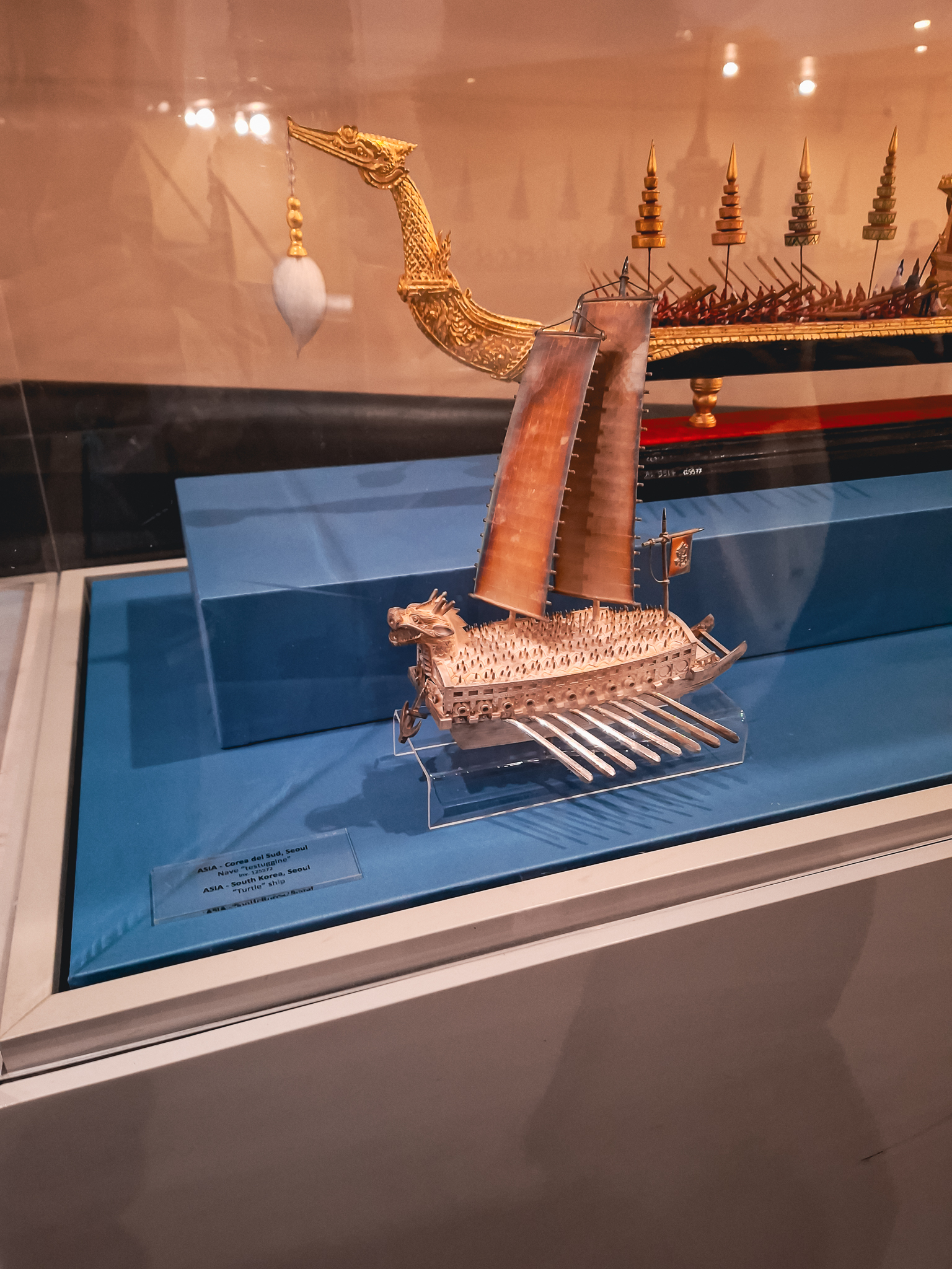 입장하면 그 유명한 나선형 계단이 나오고 옆에 뜬금없이 거북선도 있습니다.