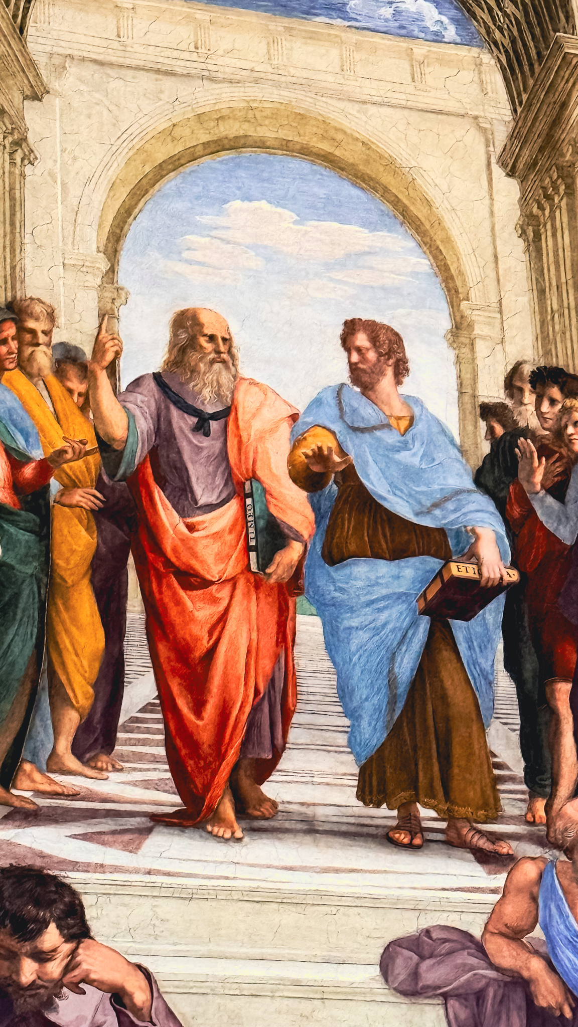 정중앙에 아리스토텔레스와 플라톤이 있고, 주변에는 소크라테스, 피타고라스, 유클리드 등이 있습니다.