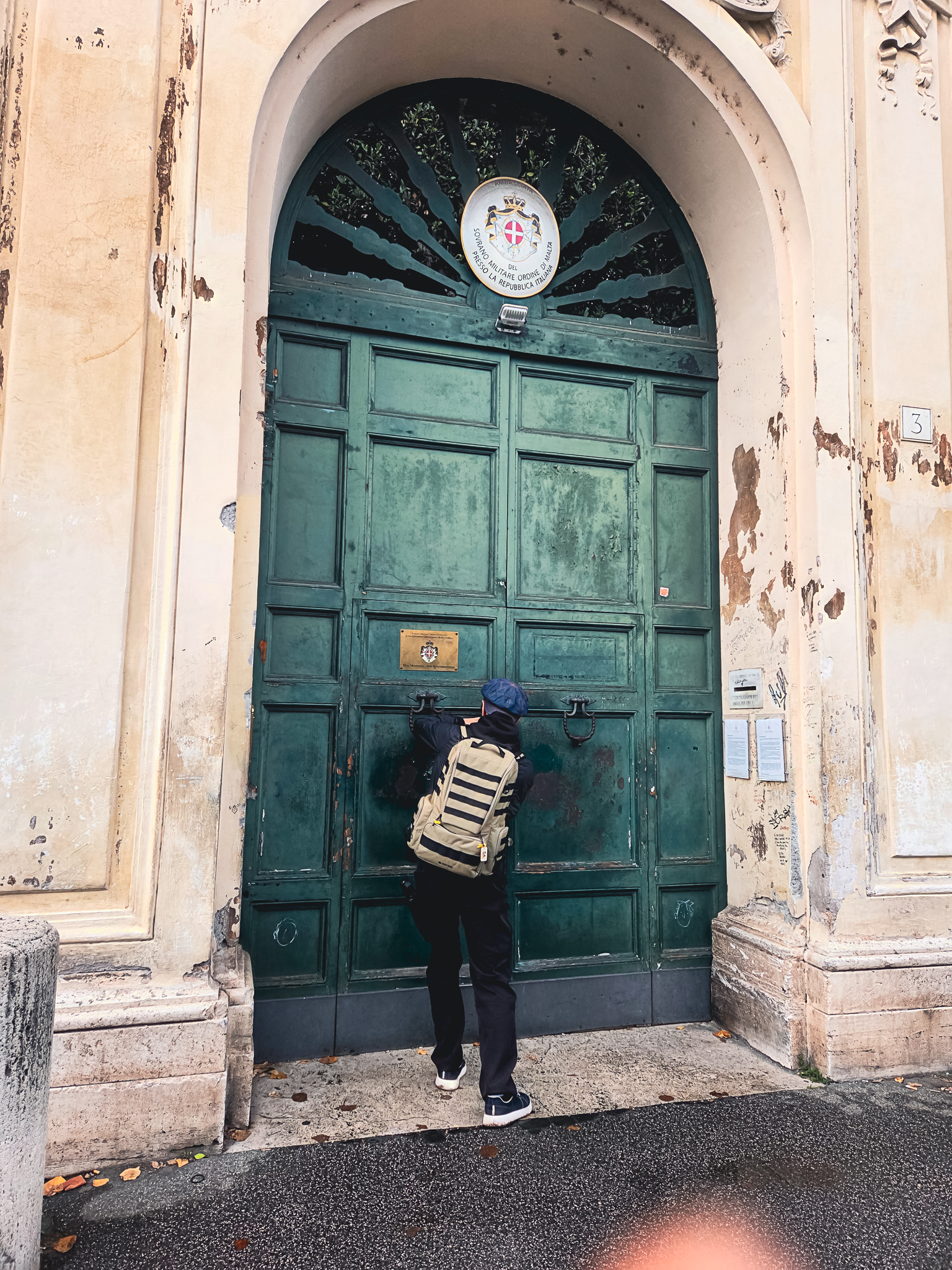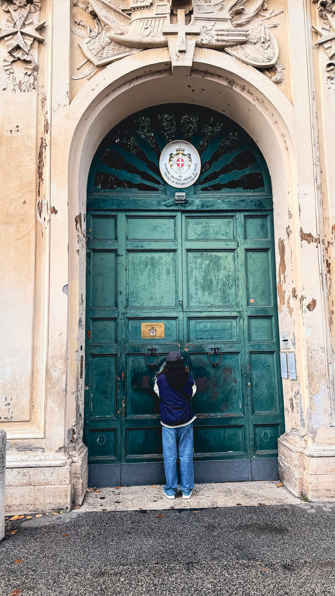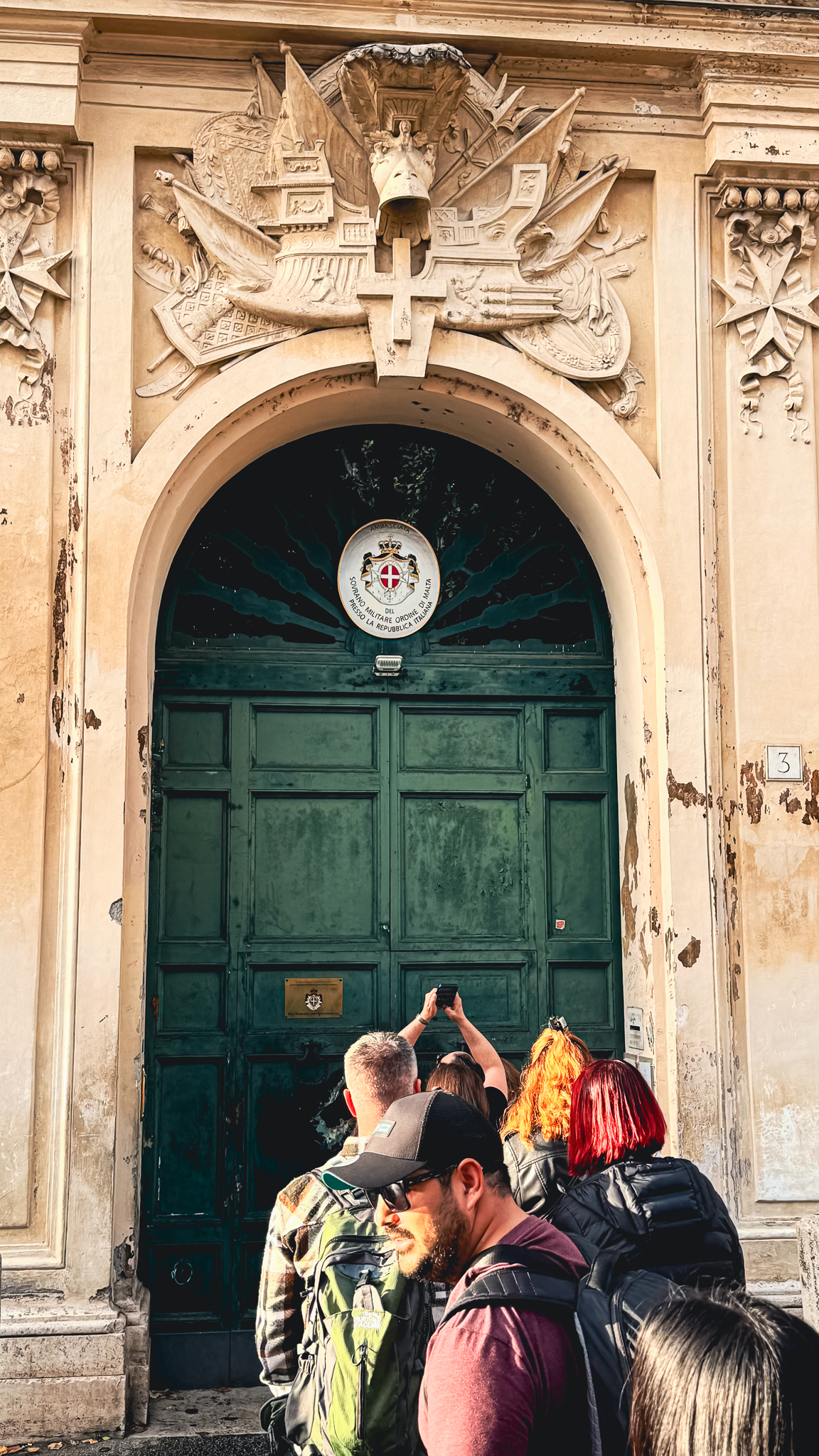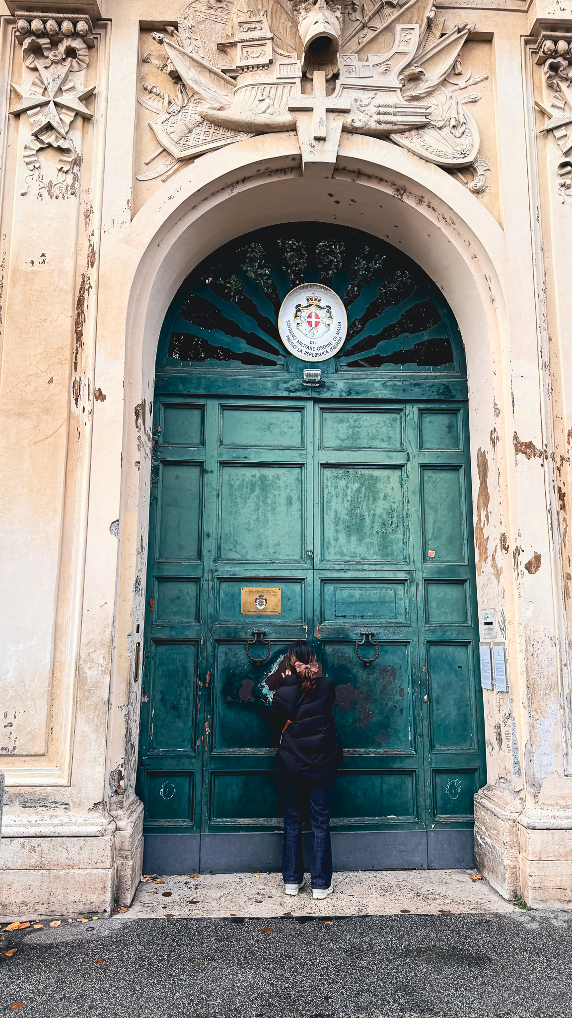 이곳에서는 저 앞에 있는 문의 열쇠구멍을 통해 성 베드로 성당의 쿠폴라를 보기 위해 이 사람들이 기다리는 것입니다.