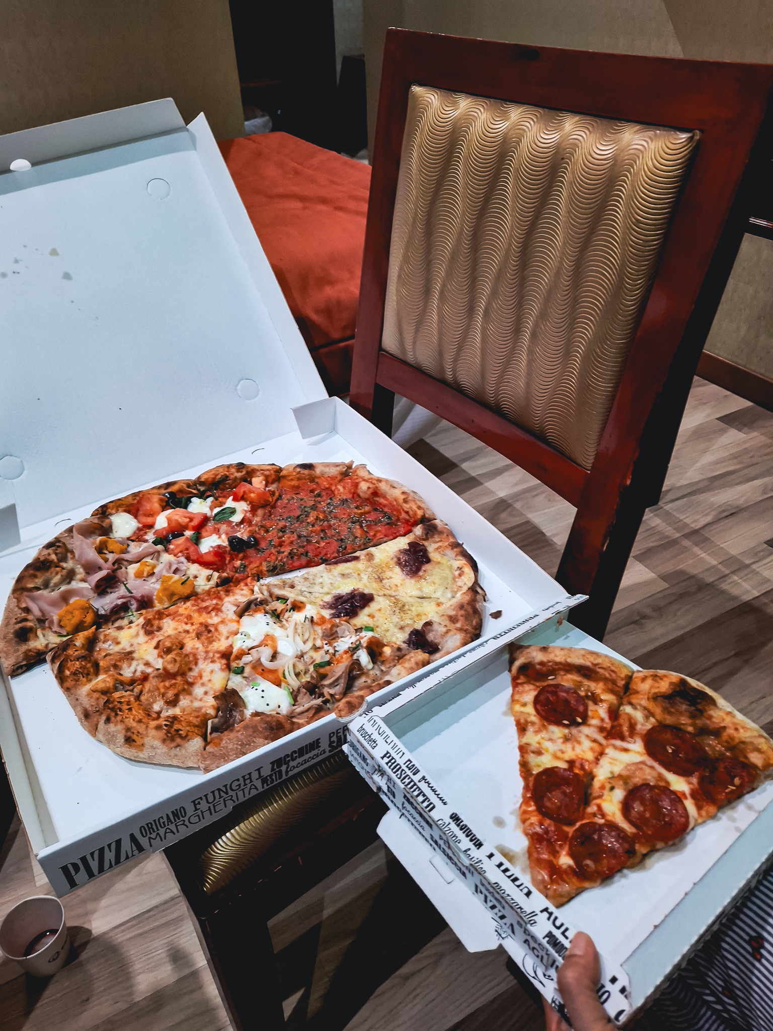 저녁은 근처 피자 가게에 들러 테이크아웃으로 포장해서 호텔에서 배 터지게 먹었습니다.
