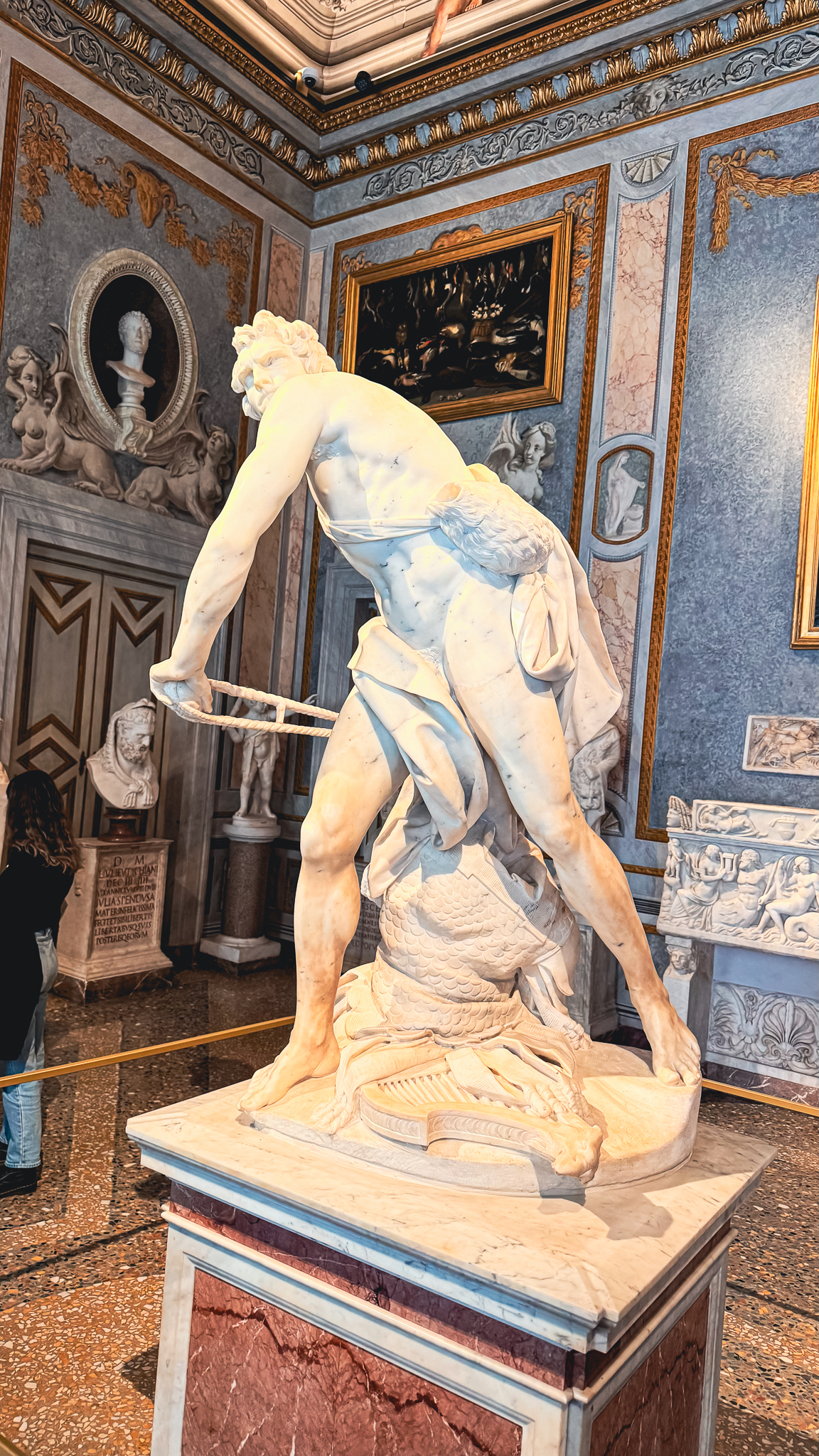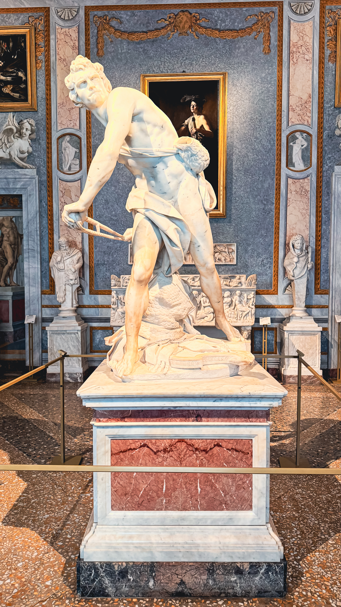 베르니니의 '다윗 (David)'은 1623–1624년에 제작된 바로크 대리석 조각으로, 성서 속 다윗이 골리앗을 향해 돌을 던지기 직전의 역동적 순간을 포착한 작품입니다.