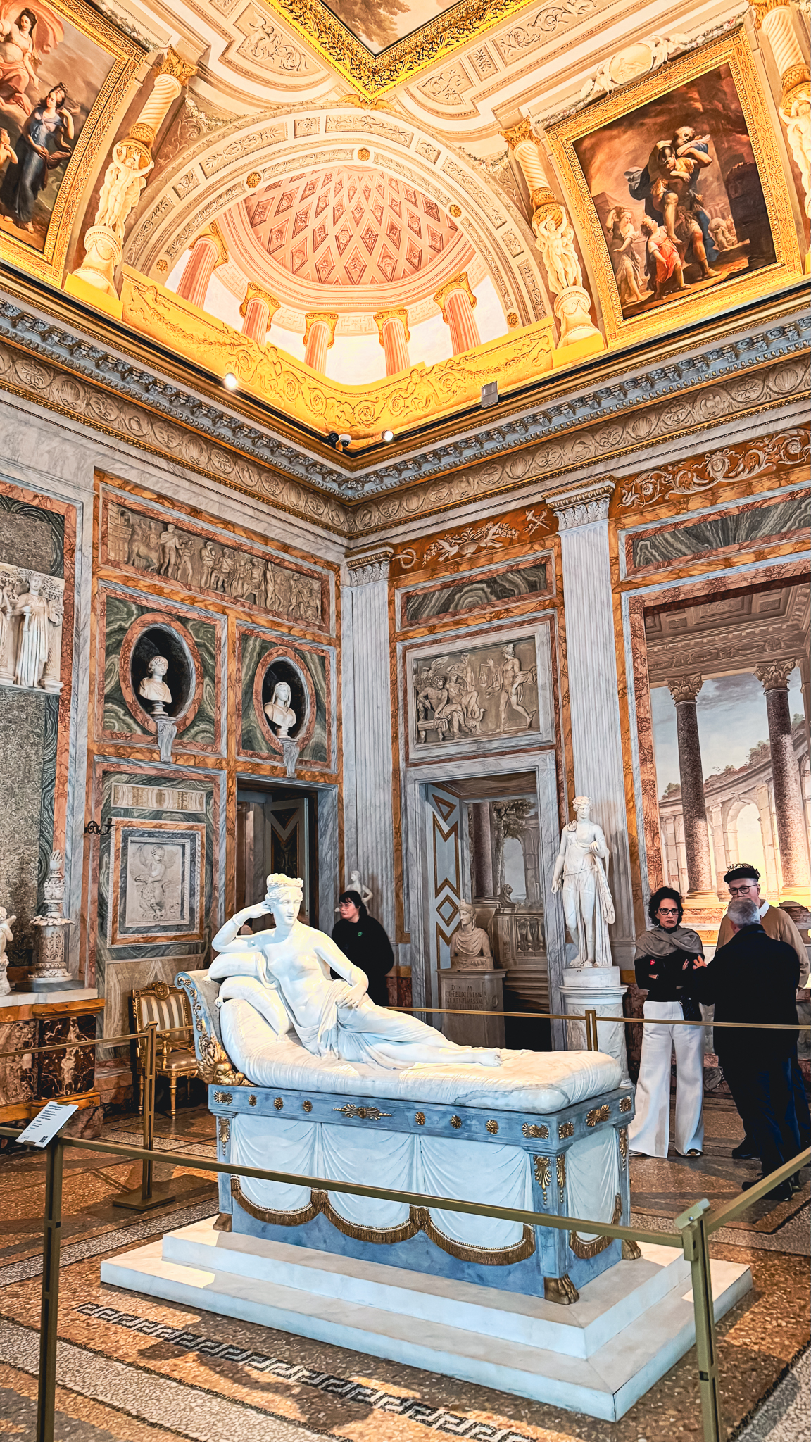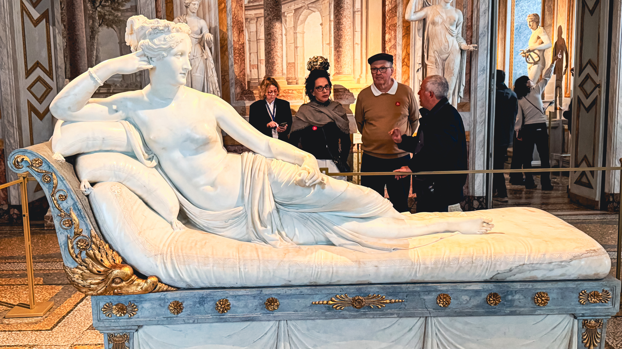 마치 비너스인 것처럼 보이는데, 안토니오 카노바의 '파올리나 보르게세, 비너스로서 (Paolina Borghese as Venus Victrix)'는 1805–1808년에 제작된 네오클래식 대리석 조각으로, 나폴레옹의 여동생이자 보르게세 가문의 일원인 파올리나 보르게세를 승리의 비너스로 이상화해 묘사한 작품이라고 합니다.
