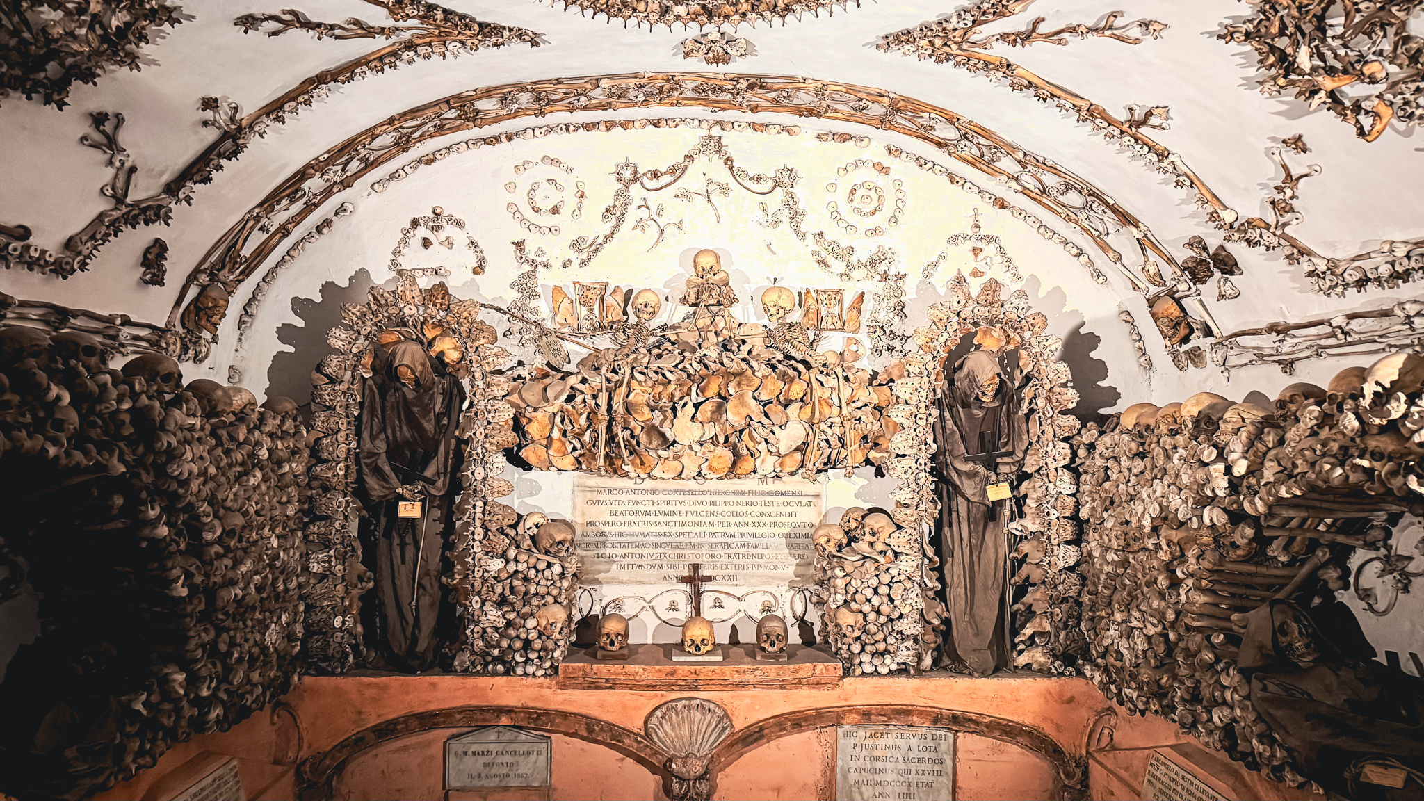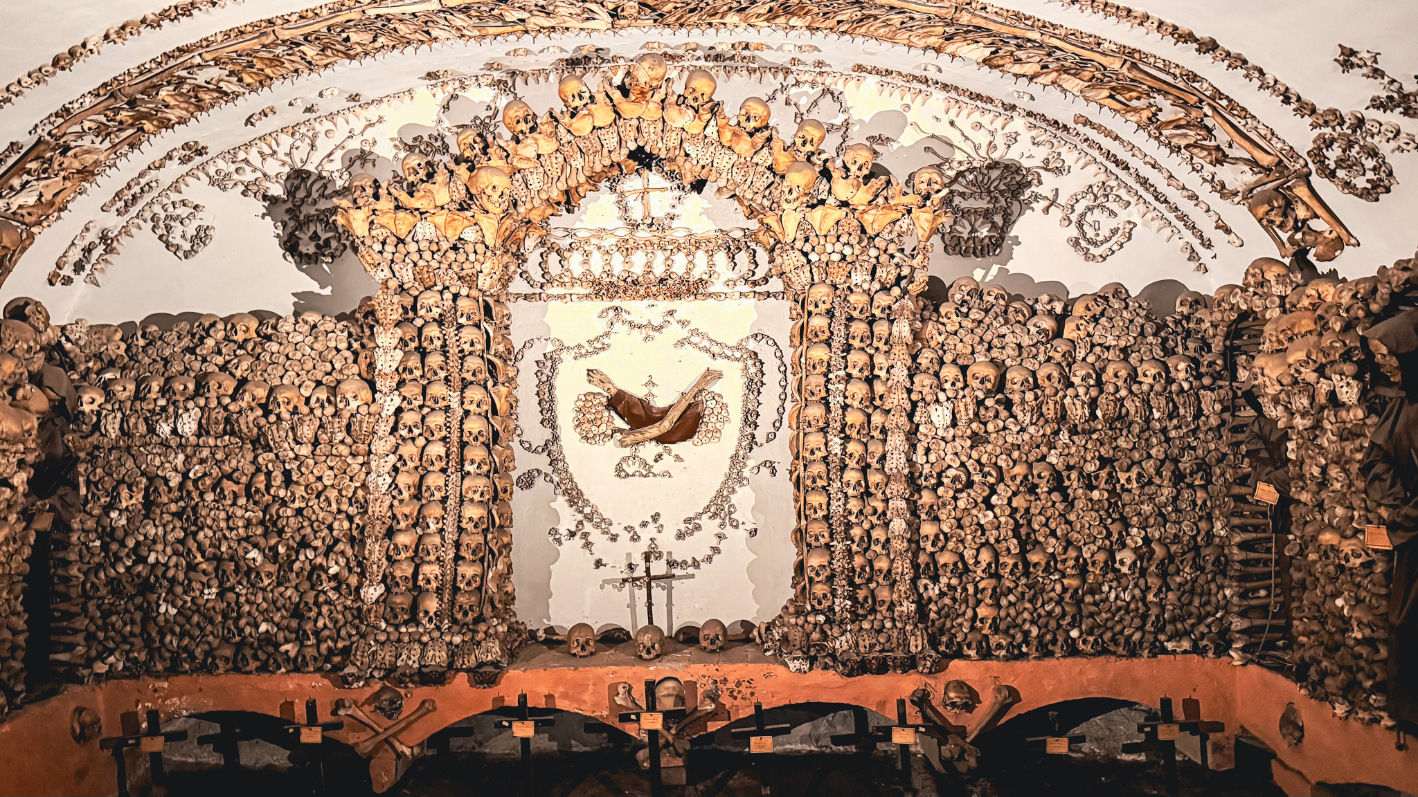 벽에 붙인 장식들도 모두 실제 사람들의 유골이고, 쌓여있는 유골들 모두 실제 유골들입니다.