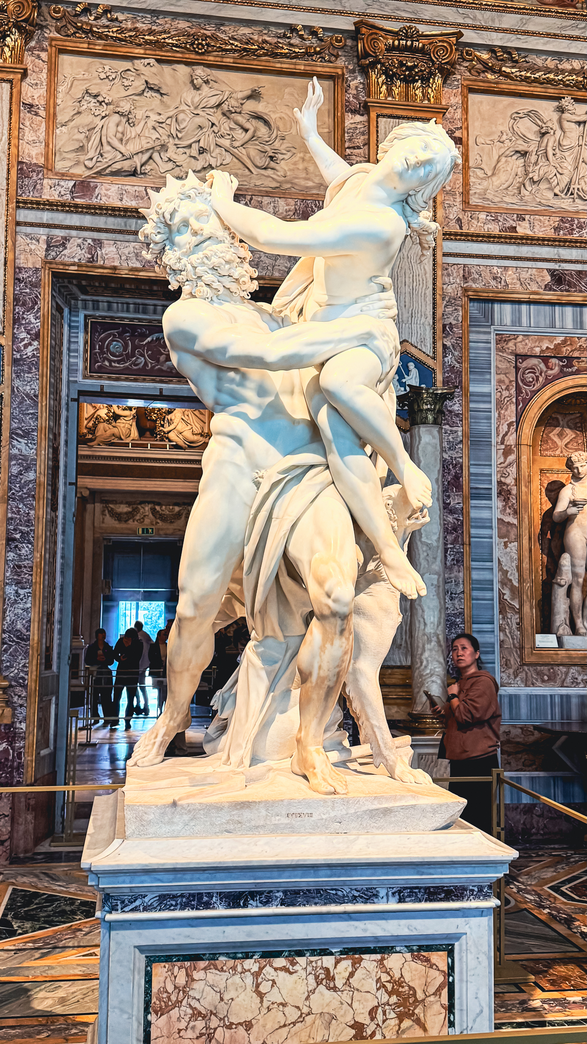 베르니니의 '프로세르피타의 납치 (Ratto di Proserpina)'는 1621–1622년에 완성된 바로크 대리석 조각으로, 지하세계의 신 플루토가 프로세르피타를 붙잡아 데려가는 절정의 순간을 극적으로 포착한 작품입니다. 카라라 대리석으로 만든 두 인물의 뒤틀린 역동성과, 플루토의 손가락이 그녀의 허벅지를 파고드는 듯한 사실적 표현, 발치의 케르베로스가 지하세계의 경계를 상징하는 세부가 특징이라고 합니다.