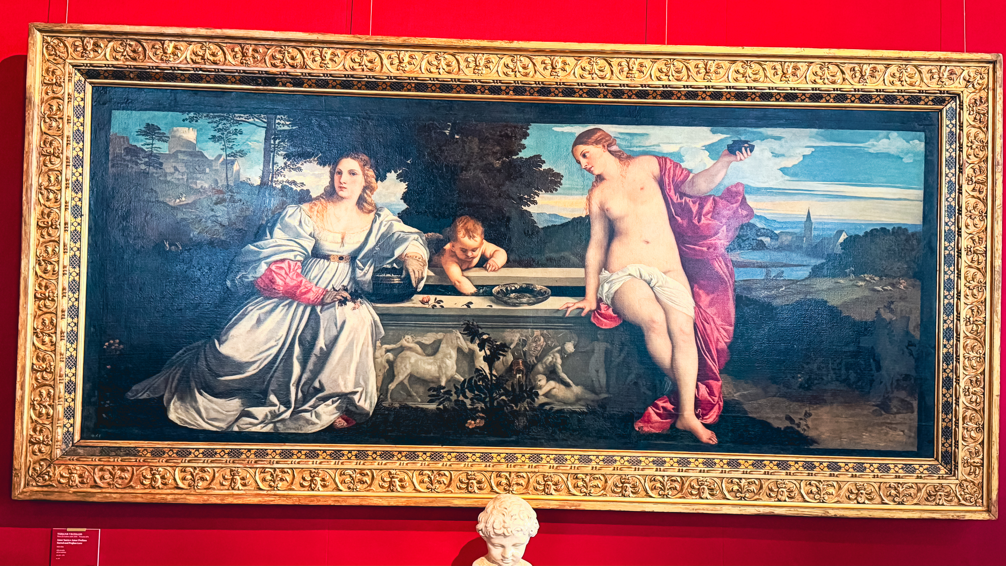 티치아노의 '성스러운 사랑과 세속적인 사랑 (Amor Sacro e Amor Profano)'는 1514년경에 제작된 르네상스 후기의 대표적 유화로, 두 여성 인물을 통해 신성한 사랑과 세속적 사랑의 대비를 표현한 작품입니다.