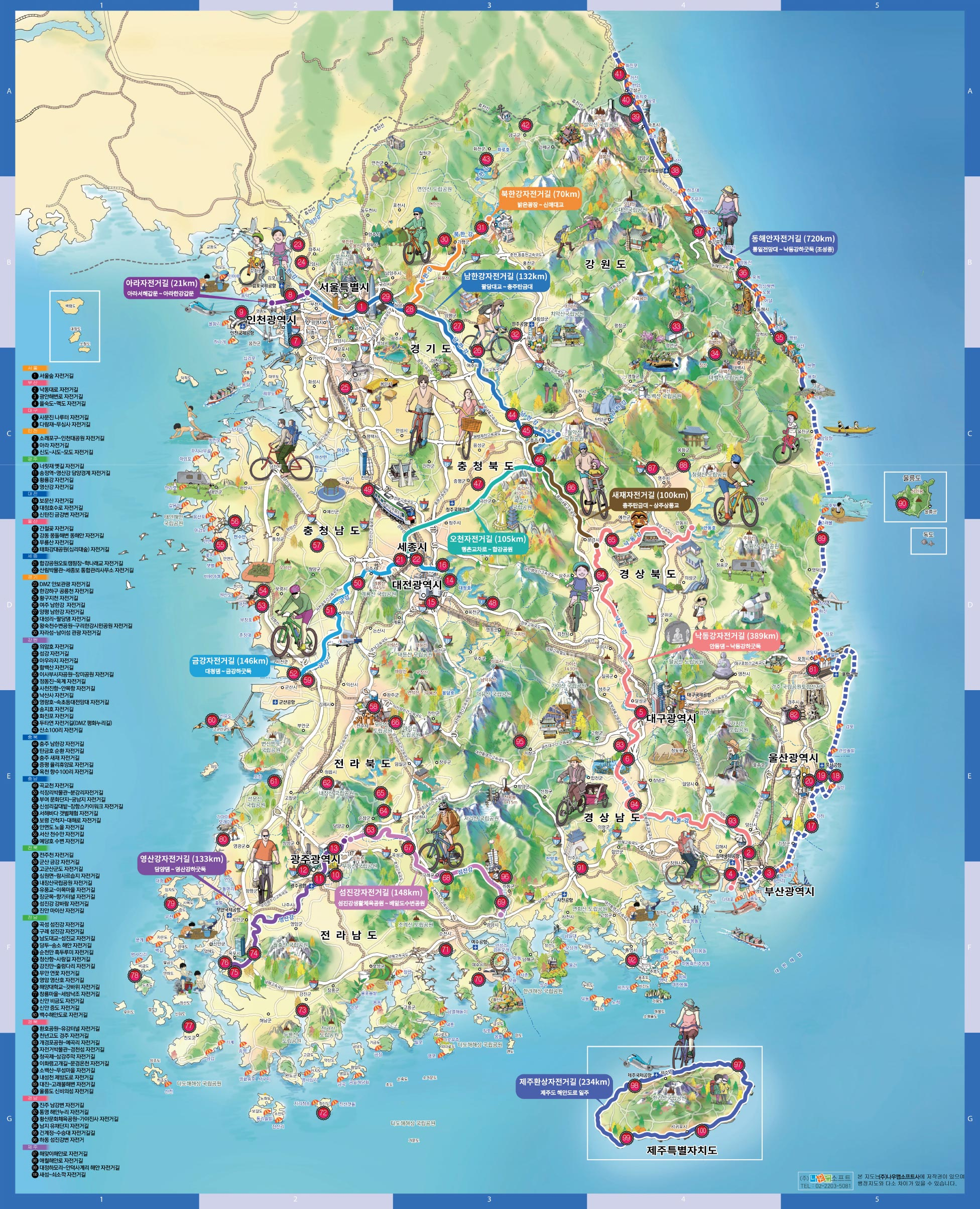 그래서 국가적으로 자전거길을 조성하여 안전을 도모하고자 한 것입니다. 완전히 자전거 전용도로만 있는 것은 아니지만 어쨌든 국도 변에 자동차와 함께 달리는 일은 최소화한 것으로 이해하면 됩니다. 우리나라의 자전거길 100선을 지도로 살펴보시기 바랍니다.
