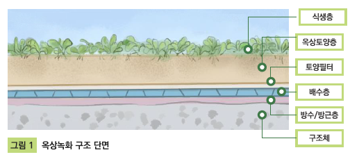 즉, 옥상녹화란 옥상에 화분 몇 개 갖다 놓았다고 녹화를 한 것이 아니라 인위적으로 토양층을 만들고 해당 토양층에서 식물이 생존할 수 있도록 배수층과 토양 필터 등을 설치한 것을 통칭하는 것입니다.