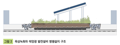 옥상녹화와 태양광 발전설비의 병행 설치란 건축물 옥상공간에 옥상녹화와 태양광 발전설비를 함께 설치하여 운영하는 것을 지칭합니다. 옥상녹화와 태양광 발전설비의 병행설치는 도시 생물다양성의 확보와 에너지 소요량 저감 및 발전 효율 향상의 시너지 효과를 창출하는 것에 목적이 있고 이를 위한 정책적 방안에 활용이 되고 있습니다. 컨셉 디자인은 아래와 같습니다.