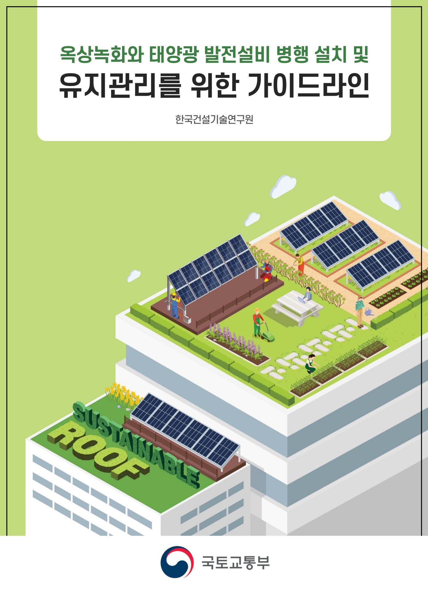 한국건설기술연구원 (KICT)에서 만들고 국토교통부에서 2022년 1월 14일에 발표한 옥상녹화와 태양광 발전설비 병행 설치 및 유지관리를 위한 가이드라인입니다. 이젠 기존 건축물도 마찬가지지만 신축 건물에서는 특히 옥상 녹화와 태양광 설치를 고민해야 합니다. 이에 대한 설치 및 유지관리에 대한 가이드라인을 제시한 것으로 이해하시면 됩니다. 아래 링크에서 원문을 다운로드 하실 수 있습니다.