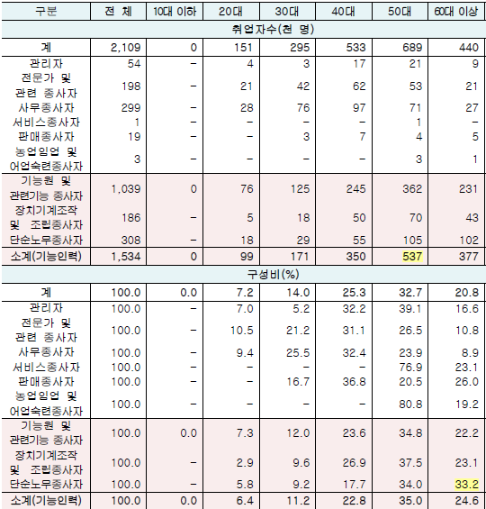 위의 표 중 취업자수의 단위는 천명입니다. 50대 이상 기능인력 취업자수가 50만명 가량으로 가장 높았습니다. 기능인력의 연령대별 분포는 50대(537천 명), 60대 이상(377천 명), 40대(350천 명)의 순입니다. 40대 이상 비중이 전체 기능인력의 82.4%, 장치기계조작 및 조립종사자의 경우 87.5%를 차지하고 있으며, 60대 이상 비중은 전체 기능인력의 24.6%, 단순노무종사자의 경우 33.2%를 차지하고 있습니다. 건설현장의 고령화 문제도 점점 심각한 수준이 되어 가는 것 같습니다.