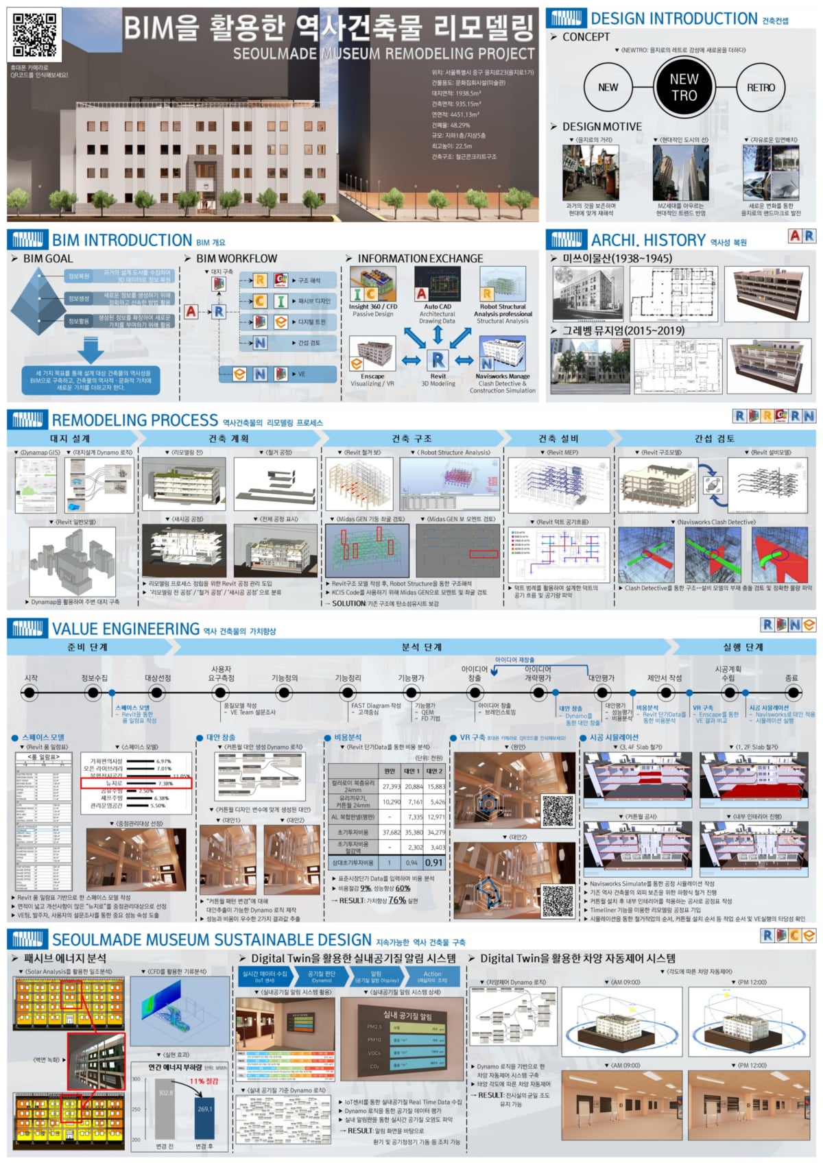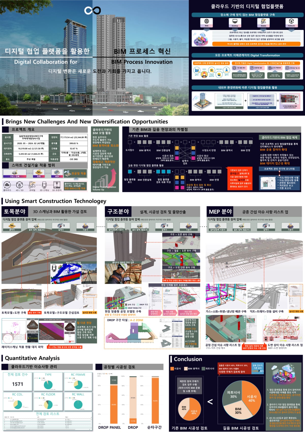 제가 가장 주목한 수상작품입니다. 한미글로벌에서의 건설사업관리(CM) 단장을 경험해봤기 때문에 설계 및 시공단계에서의 검토가 용이하고, 모든 공종에 개입하여 검토할 수 있으며, 인허가 및 행정 처리에 대한 리스크 분석까지 가능하므로 일정 및 비용 추적이 획기적으로 개선된 것으로 보입니다.