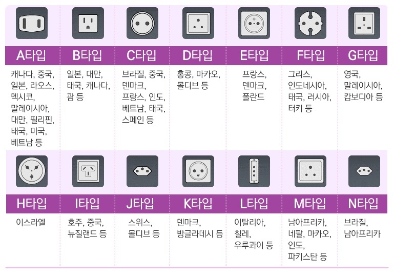 국가별로 각자 상황에 맞게 계획 및 설계하고 각자의 사연을 가지고 있기 때문입니다. 이러한 국제 규격은 이미 다양해져 버려서 통일하는 것은 불가능한 지경에 이르렀습니다. 아래와 같이 메모해두고 필요할 때마다 찾아봐가면서 여행을 가거나 출장을 가는 수밖에 없을 것 같습니다.