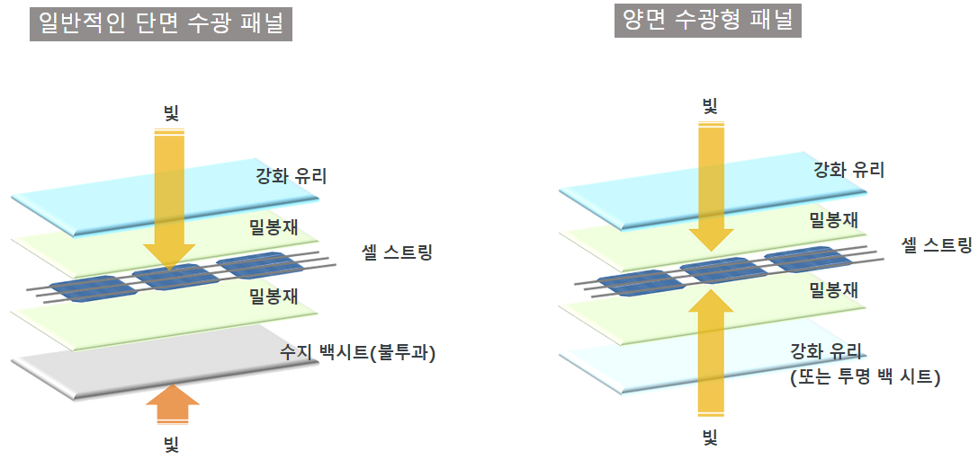 양면형 셀의 구조를 살려 후면으로부터의 채광을 가능하게 하기 위해 양면형 태양 전지 패널은 표면을 강화 유리, 후면을 한층 더 강화한 유리로 밀봉하는 구조를 채용하고 있습니다. 일부 모델의 후면은 투명 백 시트를 사용하기도 합니다. 강화 유리를 적용한 구조의 태양 전지 패널은 일반적인 패널 구조에 비해 장기적인 옥외 사용에 적합하여 수분의 침입이 적고, 자외선 노출에 의한 열화에도 영향이 적기 때문에 보다 높은 내구성을 얻을 수 있습니다.