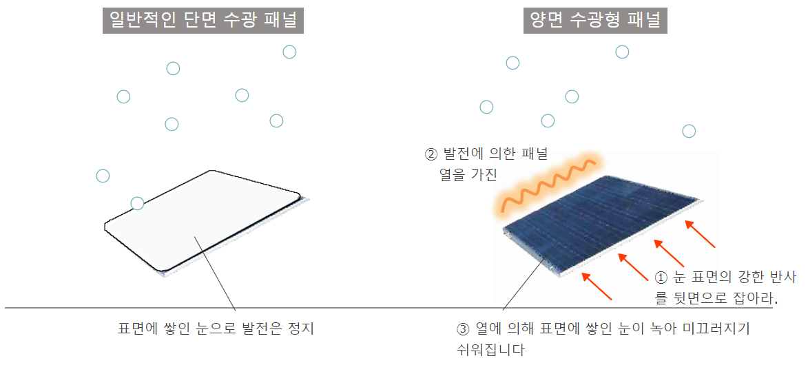 적설시 종래의 태양광 패널은 표면이 적설로 덮여 버리기 때문에 발전이 정지되는 약점이 있었습니다. 한편 양면형 패널은 후면에서 적설에 관계없이 빛을 받을 수 있습니다. 아침에 발전이 시작되면 눈이 덮힌 지표면에서 강한 반사광을 후면에서 받아 즉시 발전을 시작합니다. 후면으로부터의 수광으로 발전하기 시작한 패널은 결정형 태양전지의 특성으로 열을 발생시키기 때문에 표면에 쌓인 눈이 녹기 시작해 중력으로 미끄러져 내려오기 쉬워집니다. 따라서 양면형 패널은 일반 태양전지보다 빨리 발전을 개시할 수 있어 겨울철에도 안정된 발전량을 유지할 수 있습니다.