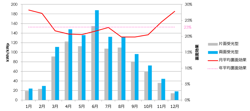 양면형 태양전지의 후면이 발전량에 가져오는 효과는 독일 프랑호퍼 연구소의 감수 하에 일반적인 지붕 구조를 가진 건물의 옥상에서 장기간 실험 관측되었습니다. 후면 효과란 발전량을 태양 전지 패널 표면의 정격치로 나눈 값(kWh/kWp)의 일반적인 단면형 패널의 발전량과 양면형 패널의 발전량의 차이를 나타낸 것입니다. 아래에는 독일 가이렌키르헨에서 계측한 양면형 패널의 후면 효과는 연간 평균 +23%를 기록했습니다.