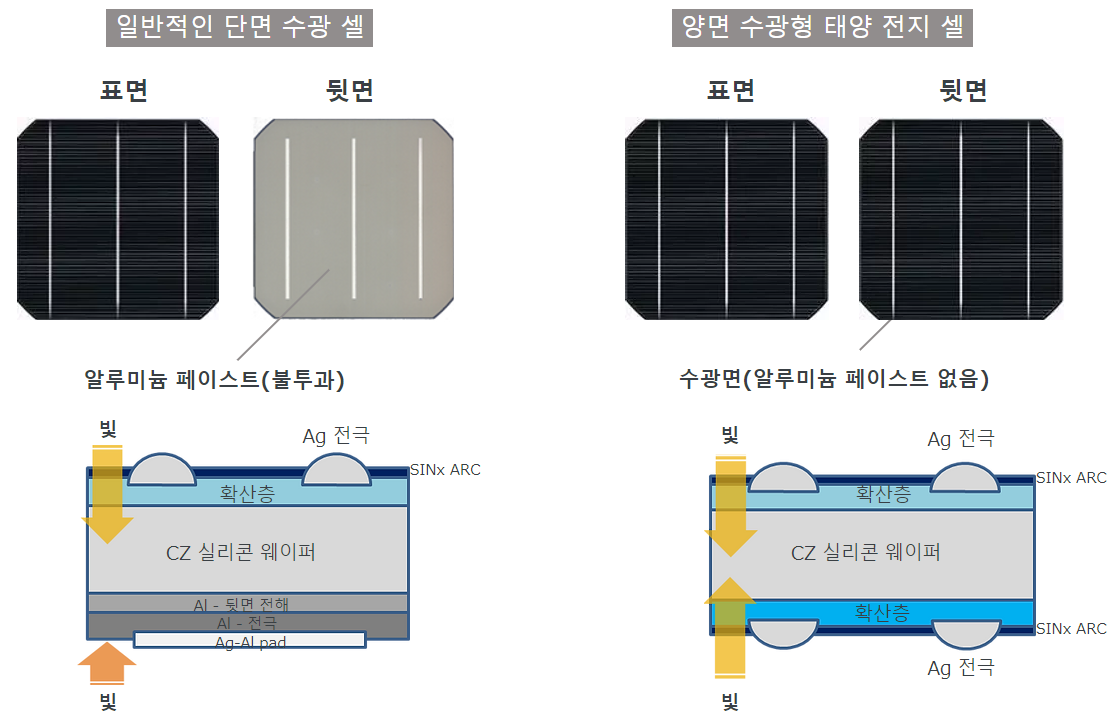 양면형 태양전지 셀은 1장의 단결정형 실리콘 웨이퍼로 제조됩니다. 종래의 일반적인 단면형 셀은 전면을 수광면으로 하고, 후면은 주로 알루미늄 페이스트 등으로 덮여 수광할 수 없습니다.