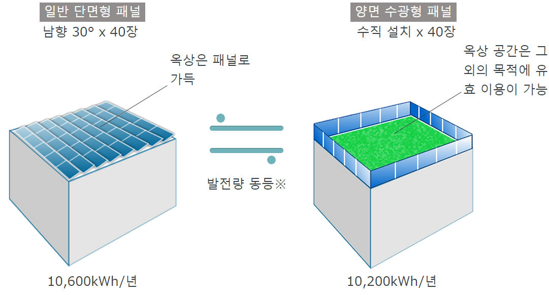 양면형 모듈은 말 그대로 모듈의 표면으로부터 태양광을 받을 뿐만 아니라, 뒷면으로도 지상, 옥상, 구름, 및 대기 중의 모든 반사 및 산란광을 수광함으로써 통상 표면의 발전량에 플러스 알파의 발전량을 얻을 수 있습니다.