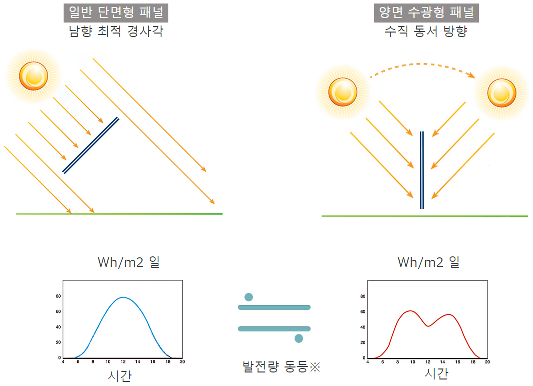 양면형 태양광 패널을 수직 설치했을 때의 또 다른 이점은 설치 방향에 의존하지 않는다는 것입니다. 일반 단면형 태양광 패널은 통상 남향 이외의 설치 방향의 경우 발전량이 크게 감소합니다. 양면형 태양광 패널의 수직 설치는 앞뒤의 수광면을 활용함으로써 동서남북 모든 방각에 설치해도 연간 거의 같은 양의 발전량을 얻을 수 있다고 알려져 있습니다. 반드시 남향으로 설치할 수 없는 환경에서도 사용할 수 있습니다.