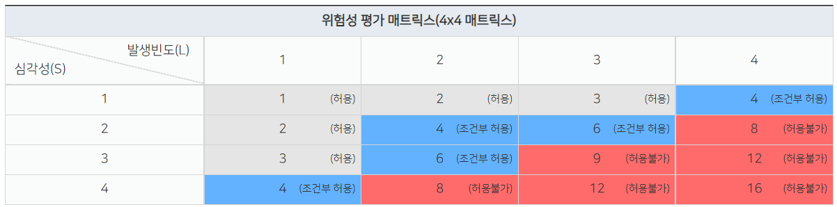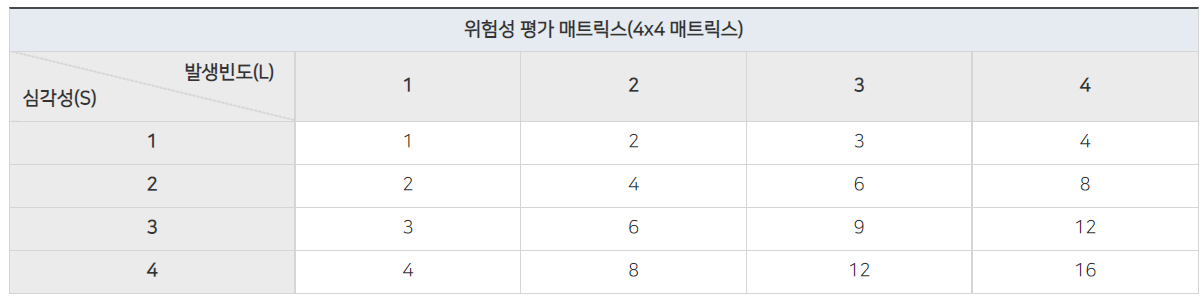 아래 예시에서 적용하는 발생빈도와 심각성을 각각 4단계로 설정 된 위험성 평가 매트릭스는 다음과 같다.