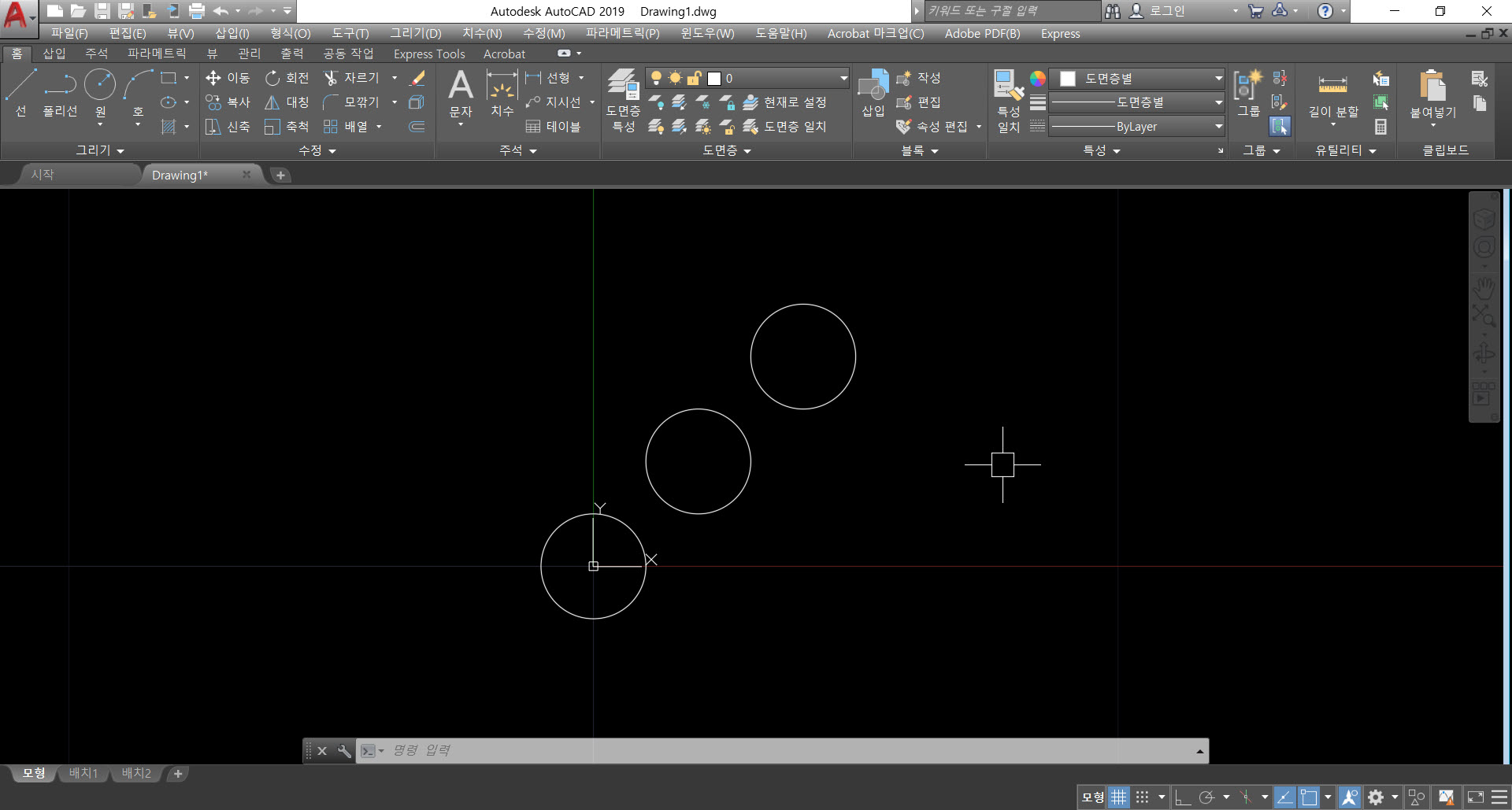 우선, 중심 좌표(0,0)를 변수 center에 격납하고, 최초의 원의 반경인 수치의 1을 변수 radius에 격납하고 있습니다. 이 예제는 이해하기 쉽기 때문에 setq를 두 줄로 나누어 각 변수에 값을 저장하지만 한 줄로 묶어도 괜찮습니다.