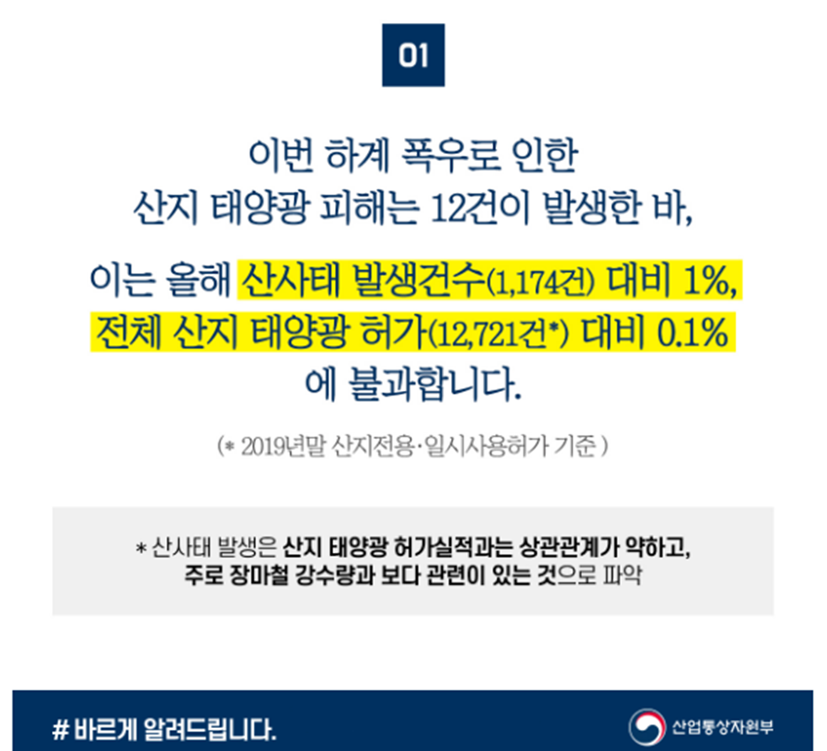 산업통상자원부에서도 워낙 이에 관한 민원과 문의가 빗발치자 다음과 같은 해명 자료를 발표한 바 있습니다. 산지 태양광의 피해는 전체 산사태 발생 건수 중 1%, 전체 산지 태양광 허가 건수 중 0.1%에 불과하다고 합니다.