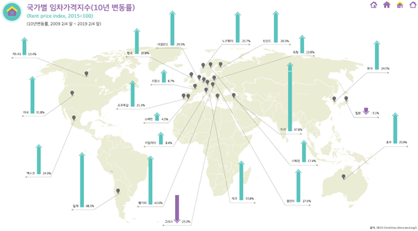 국토연구원이 경제개발협력기구(OECD)에서 발표하는 총 5종의 부동산 관련 통계(http://data.oecd.org)를 알기 쉽게 지도화 하여 ‘OECD 글로벌 부동산 통계지도’로 매년 반기마다 발간하고 있습니다. 자료는 아래 링크에서 다운로드 받으실 수 있습니다.