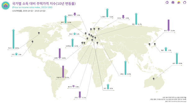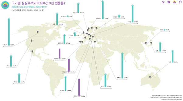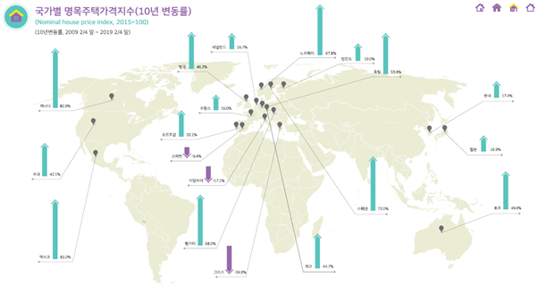 OECD 데이터베이스에서 구득이 가능한 2019년 2/4분기까지의 통계 자료를 토대로 제작했다고 합니다. 1년, 2년, 5년, 10년 변동률을 지도화 하여 단기적, 장기적 변화를 파악할 수 있도록 구성되어있습니다. 국토연구원 부동산시장연구센터는 글로벌 부동산시장 정보에 대한 소요가 증가하고 있음을 감안하여 지속적으로 다양한 해외 부동산 관련 정보를 발굴하여 제공할 계획이라고 합니다. 그 중에서 지난 10년간 집값의 변화를 알아봤습니다.