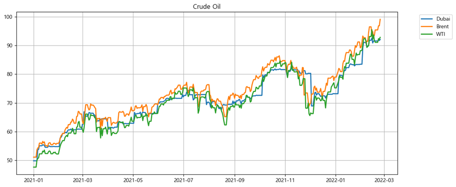 유가 (두바이, 브렌트, 텍사스산 중질유, 2021-01-01 ~ 현재)