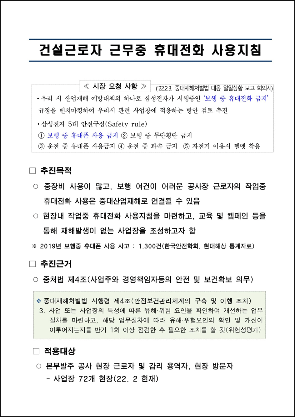 - 현장내 작업중 휴대전화 사용지침을 마련하고, 교육 및 켐페인등을통해 재해발생이 없는 사업장을 조성하고자 함