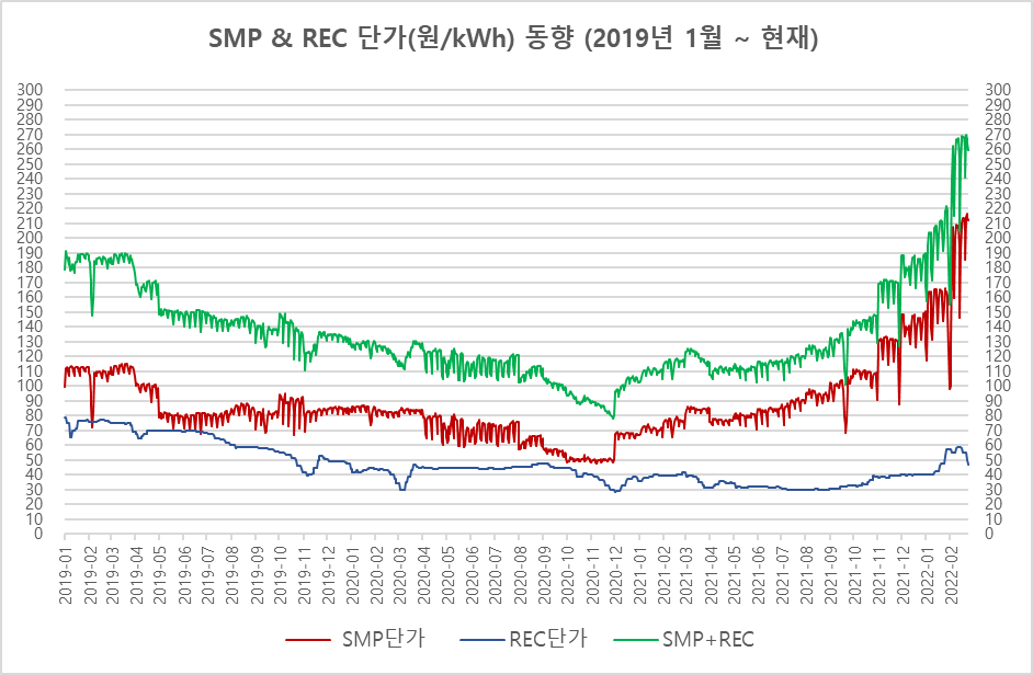 보시다시피 REC는 꾸준히 하락하고 있는데 SMP는 하락하다가 2020년 12월부터 급격히 상승 중입니다.