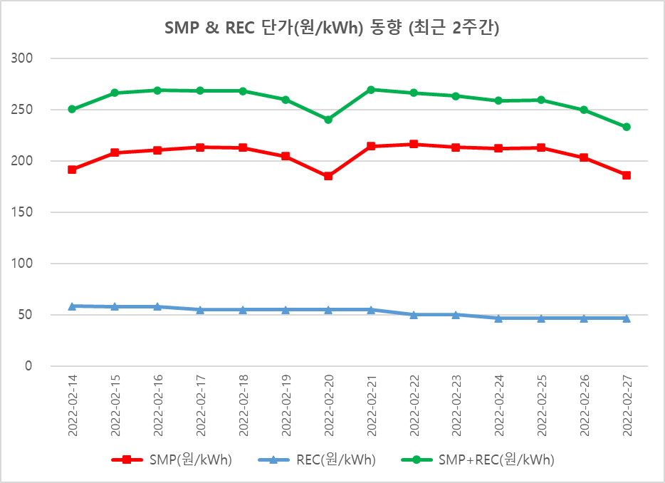 보시는 바와 같이 REC는 계속해서 하락 중이며, SMP는 고공 행진을 유지하고 있습니다. SMP의 등락은 모두 휴일인 토요일과 일요일에 하락했다가 월요일에 다시 상승하여 주간 동안 유지되다가 다시 주말이 되면 하락하는 것을 반복하고 있습니다. 어쨌든 SMP만으로 200원/kWh를 넘긴 것만으로도 대단히 이례적인 상황입니다.