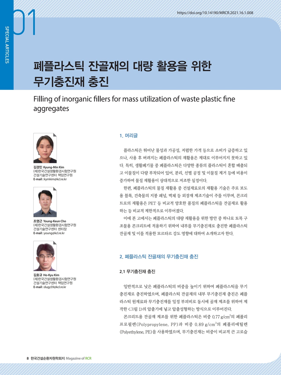 폐플라스틱의 대량 재활용을 위한 방안 중 하나로 토목 구조물용 콘크리트에 적용하기 위하여 내부를 무기충진재로 충진한 폐플라스틱 잔골재 및 이를 적용한 모르타르 강도 영향에 대하여 소개하고자 한다.