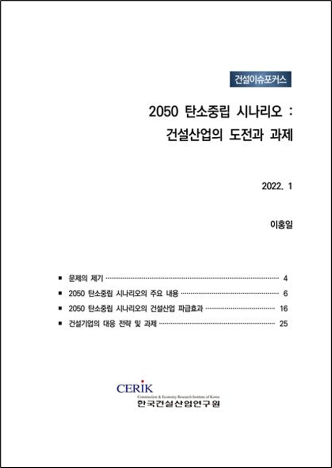 ▲ 탄소중립 시나리오 이행에 따른 국내 건설기업의 대응 전략은 개별 건설기업 단위의 탄소배출 감축, 건설상품 총생애주기 단위의 탄소배출 감축, 탄소중립에 따른 건설시장 변화 대응의 3가지 분야에 총 6대 전략으로 구분할 수 있음.