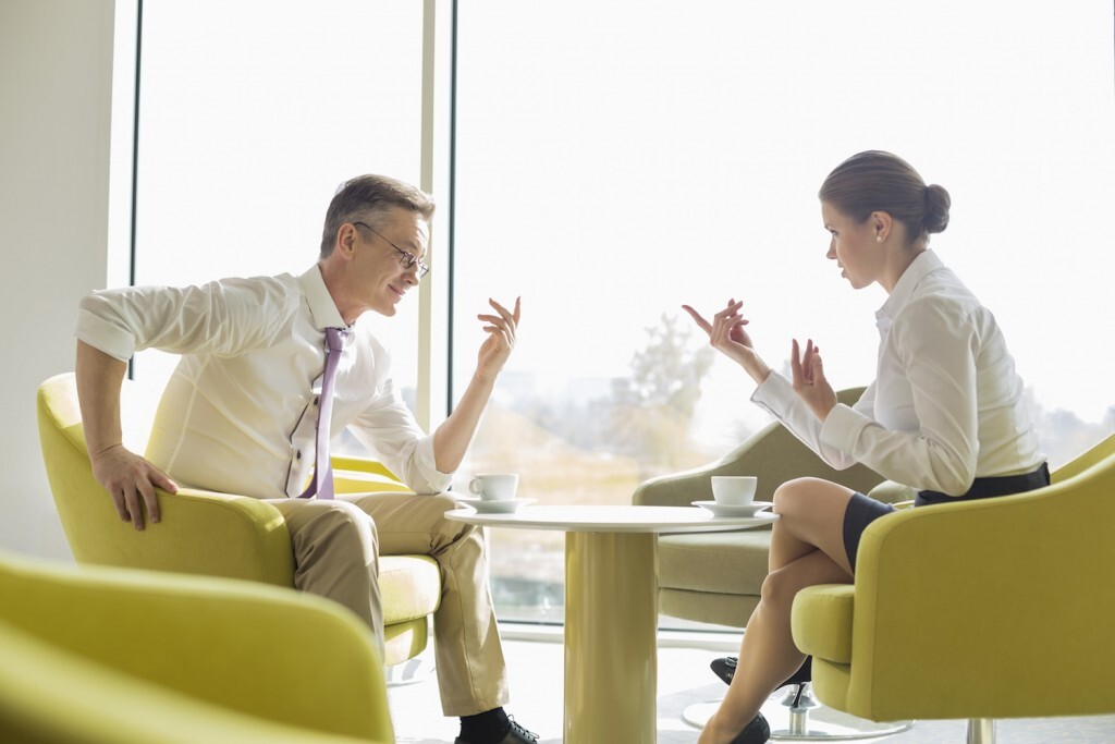 (C)는 "그들은 마주보고 있다"의 의미. 사진 내에서 남성과 여성은 대면하고 마주하고 있기 때문에 상황을 정확하게 묘사하고 있다. 따라서 정답 .