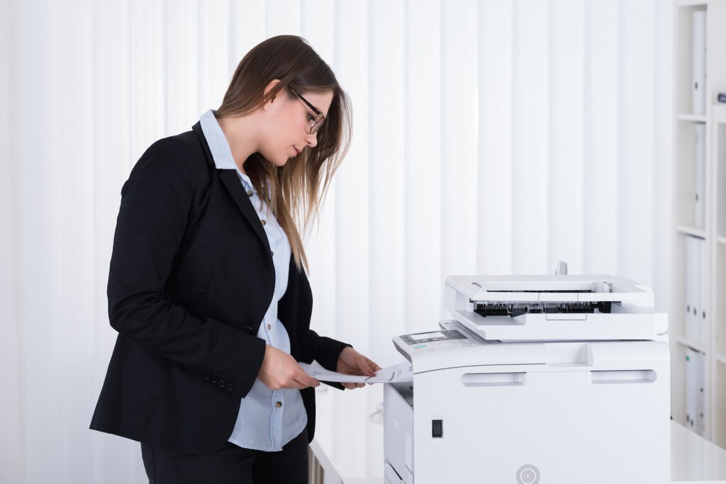(A)는 "그녀는 복사기를 사용하고 있다"의 의미. 사진에서 알 수 있듯이, 그녀는 바로 복사기를 사용하고있는 동안 정답 .