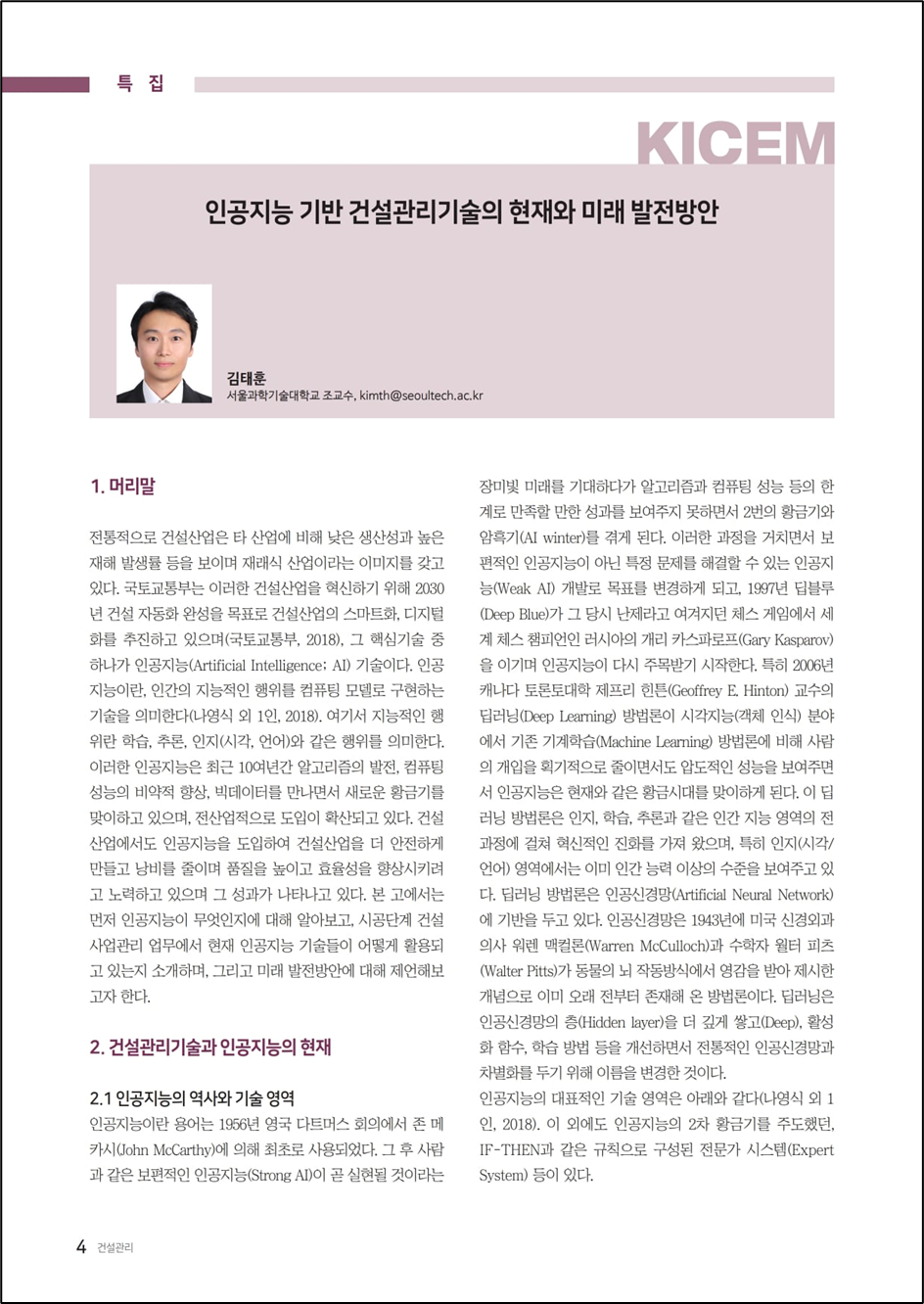 먼저 인공지능이 무엇인지에 대해 알아보고, 시공단계 건설사업관리 업무에서 현재 인공지능 기술들이 어떻게 활용되고 있는지 소개하며, 그리고 미래 발전방안에 대해 제언해보고자 한다.