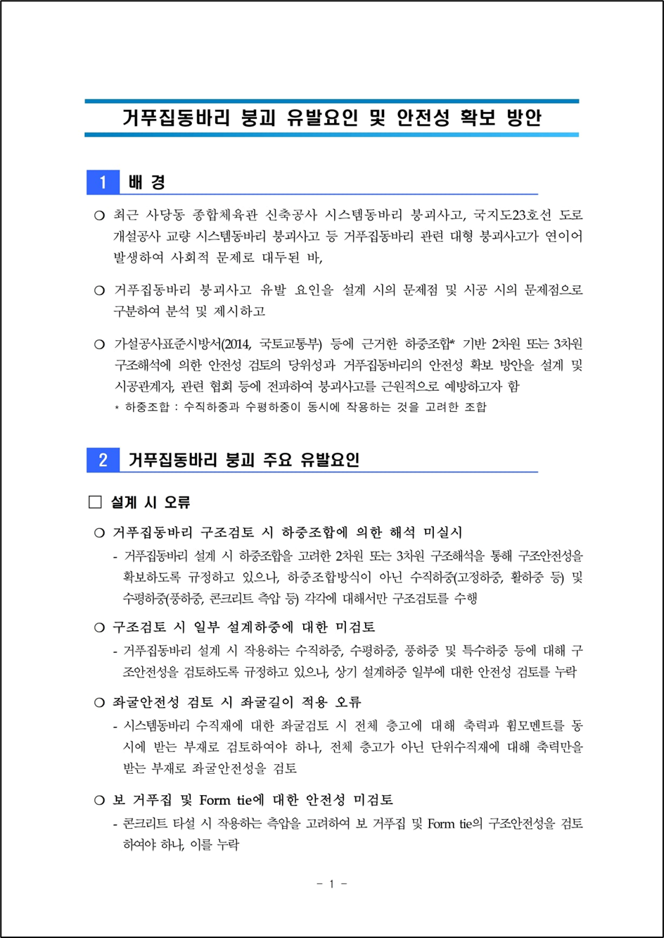 - 최근 사당동 종합체육관 시스템동바리 붕괴사고, 용인 도로개설공사 교량 시스템동바리 붕괴사고 등 거푸집동바리 관련 대형 붕괴사고가 연이어 발생하여 사회적 문제로 대두된 바,