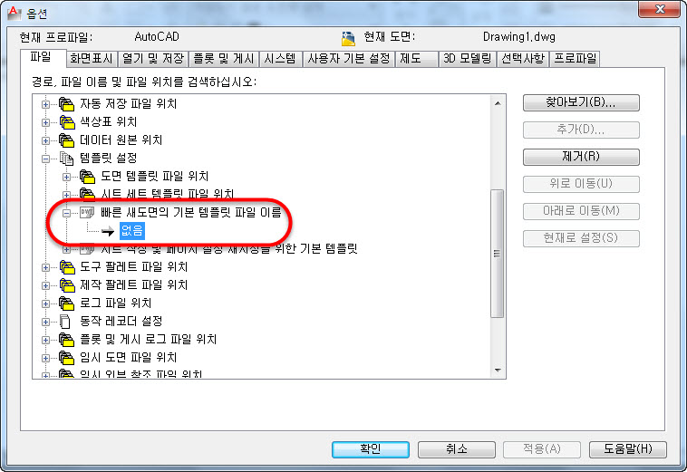 그림의 폴더 위치는 초기 값이 입력되어 있지 않았기 때문에 Qnew 명령을 입력하면 시작 대화창이 로드되거나 어떤 Templates로 시작할지를 사용자에게 물어보게 됩니다. 따라서 이곳에 Templates 파일을 등록해두면 Qnew 명령 때마다 해당 파일이 자동으로 열리게 되어 더욱 편리합니다.