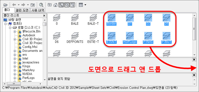 방법은 간단합니다. Design Center 대화창을 열고 도면층을 포함하고 있는 도면 하나를 선택해서 도면층 목록을 열고 해당 도면층을 마우스로 선택해서 현재 도면으로 드래그 앤 드롭하면 쉽게 해결됩니다.