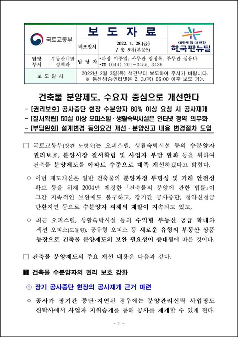국토교통부(장관 노형욱)는 오피스텔, 생활숙박시설 등의 수분양자 권리보호, 분양시장 질서확립 및 사업자 부담 완화 등을 위하여 건축물 분양제도를 아파트 수준으로 대폭 개선하겠다고