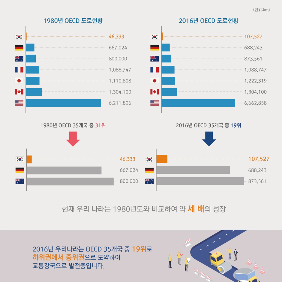 1980년에 비해 우리나라의 도로는 약 3배 성장했습니다. 사실 다른 국가들과 총 연장을 비교하는 것은 의미가 없는 것 같습니다. 왜냐하면 국토의 면적이 넓으니 그만큼 도로의 길이도 길어질 수밖에 없기 때문입니다. 어쨌든 눈부시게 성장한 도로 인프라로 인해 경제도 그만큼 성장했다고 봐야 합니다.