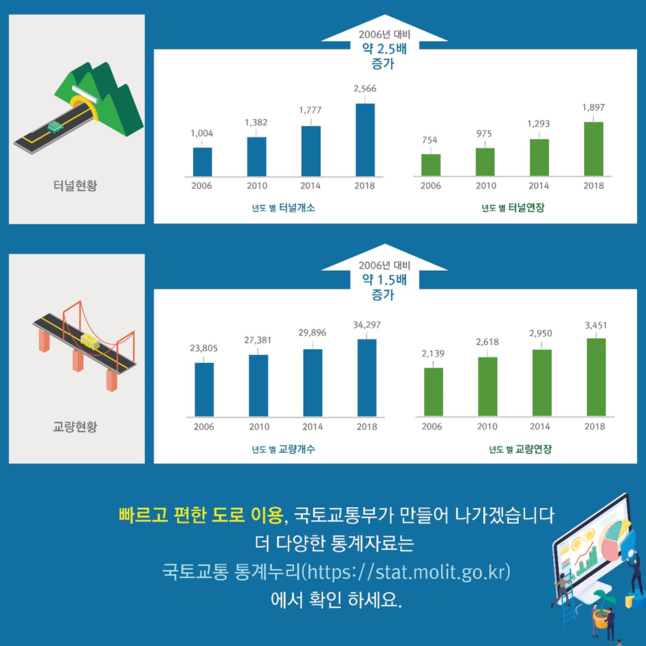 터널의 수와 연장은 2006년 대비 약 2.5배 증가했고, 교량의 수와 연장은 약 1.5배 이상 증가했다고 합니다. 도로, 터널, 교량의 수가 급증한 만큼 유지관리도 잘해야 합니다. 짓는 것만큼 잘 관리하는 것이 중요합니다.