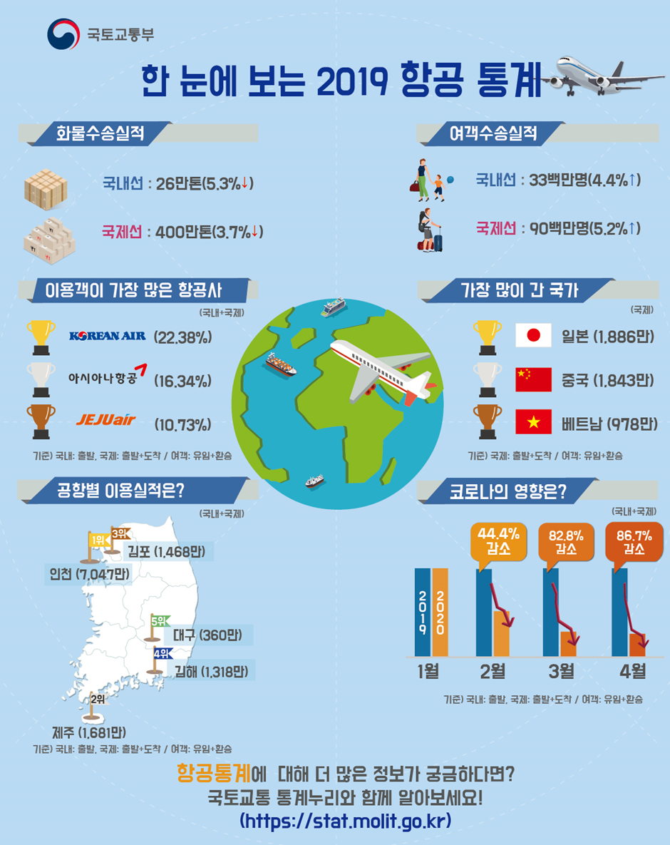 우리나라의 항공을 이용한 화물 수송은 2019년 현재 국내선 26만톤, 국제선 400만톤으로 국제선이 압도적으로 많습니다. 그리고 여객 수송은 국내선 3,300만명, 국제선 9,000만명이 이용한 것으로 조사되었습니다. 2019년은 코로나-19 사태가 시작되기 직전인데 국제선을 이용해 해외로 출장이나 여행을 간 사람들이 9천만명이나 되니 우리나라 인구의 약 두배에 육박합니다.